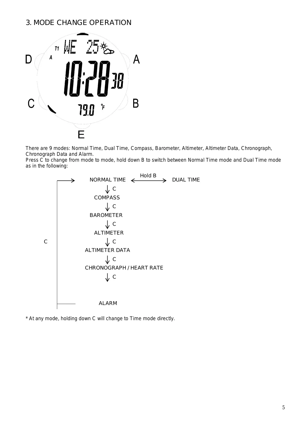 HE 24, D A There are 9 modes: Normal Time, Dual Time, Compass, Barometer, Altimeter, Altimeter Data, Chronograph, Chronograph Data and Alarm. Press C to change from mode to mode, hold down B to switch between Normal Time mode and Dual Time mode as in the following: Hold B —> NORMAL TIME Ÿ c COMPASS Ÿ c BAROMETER Ÿ c ALTIMETER C Ÿ c DUAL TIME ALTIMETER DATA Ÿ C