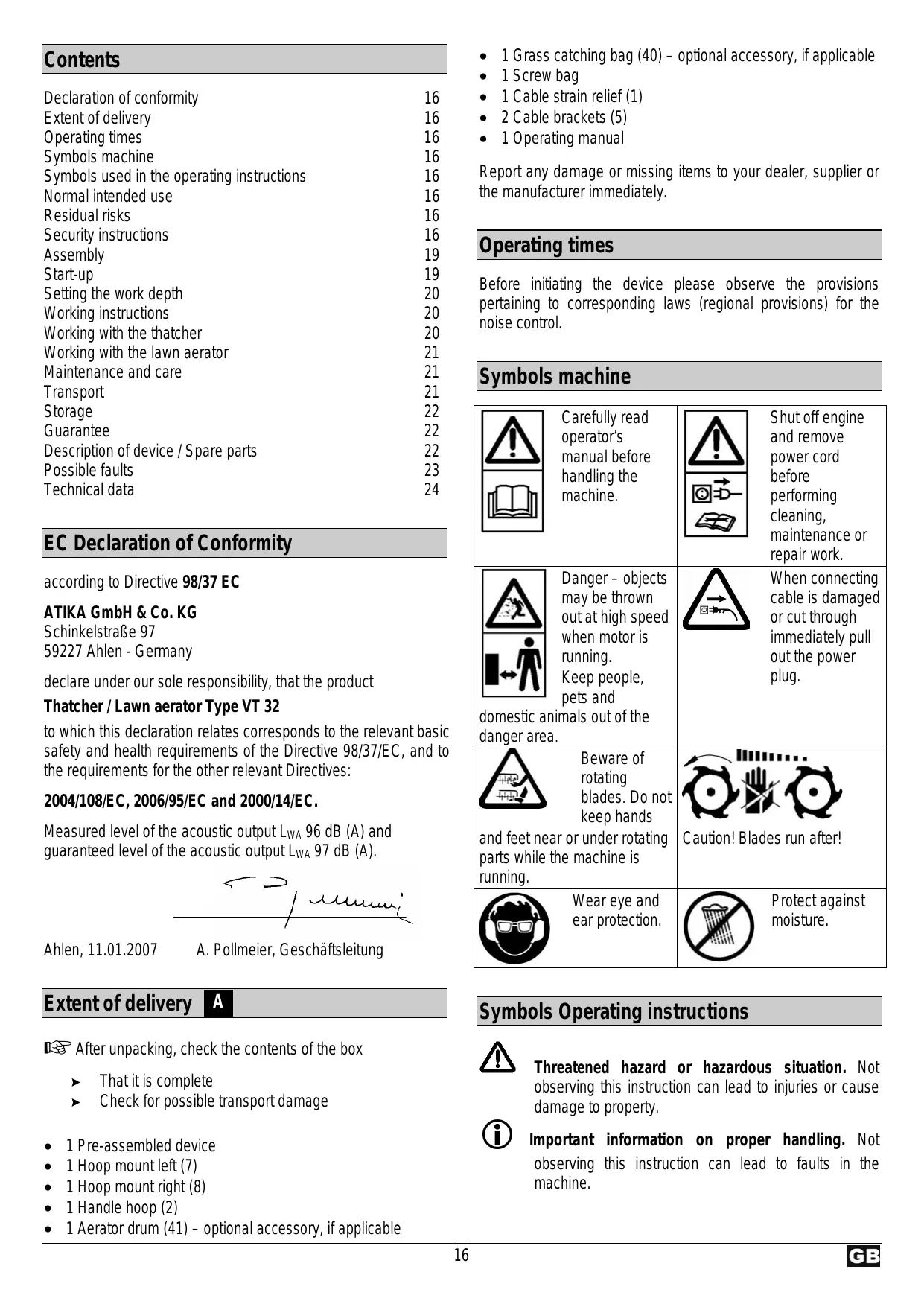 - Arbitrary modifications on the Thatcher / lawn aerator exclude a liability of the manufacturer for damages of all kinds resulting from it.