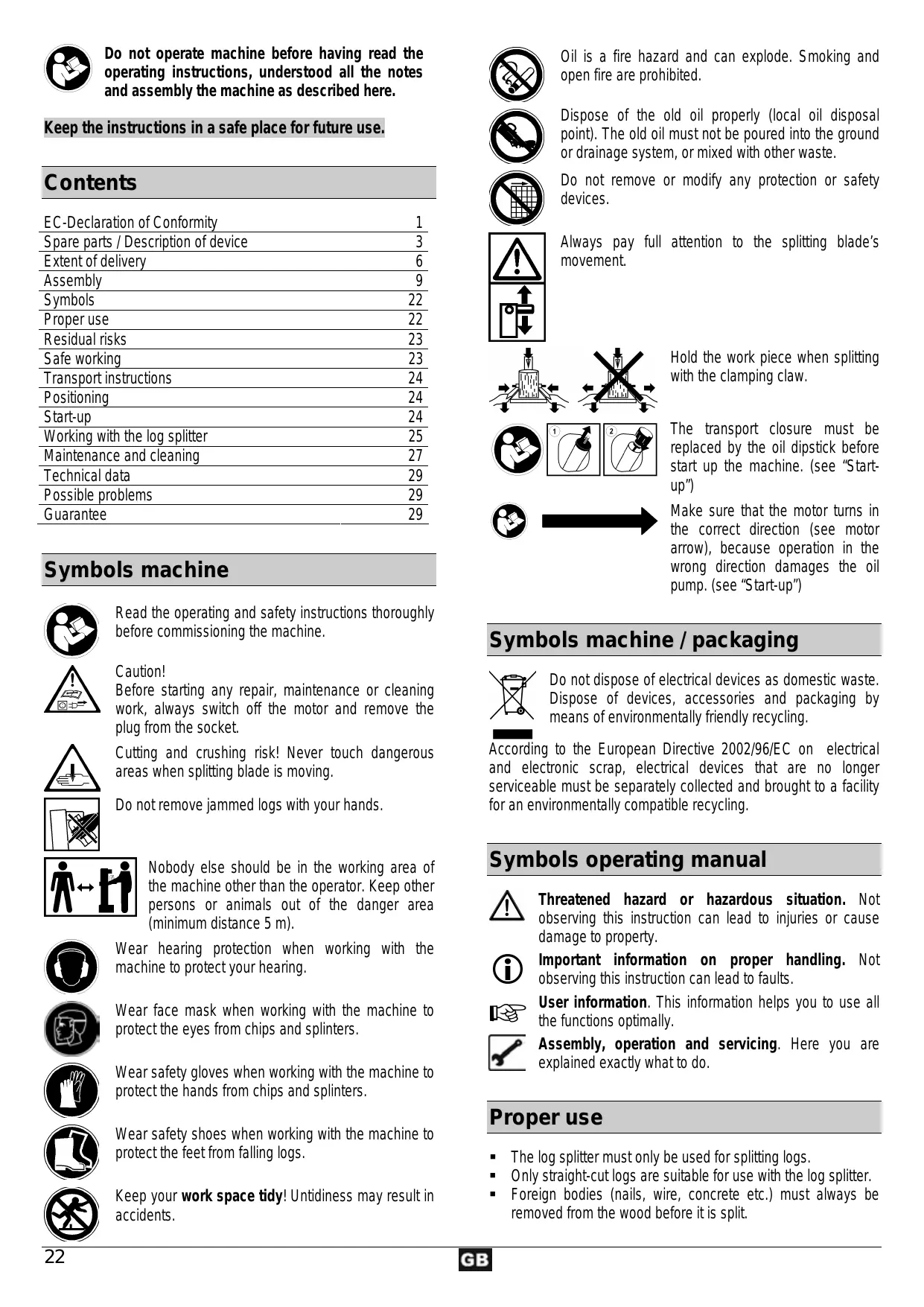 operating instructions, understood all the notes (és Do not operate machine before having read the and assembly the machine as described here. Keep the instructions in a safe place for future use. Oil is a fire hazard and can explode. Smoking and open fire are prohibited. Do not remove or modify any protection or safety devices. Contents EC-Declaration of Conformity 1 Spare parts / Description of device 3 Extent of delivery 6 Assembly 9 Symbols 22 Proper use 22 Residual risks 23 Safe working 23 Transport instructions 24 Positioning 24 Start-up 24 Working with the log splitter 25 Maintenance and cleaning 27 Technical data 29 Possible problems 29 Guarantee 29 Symbols machine Read the operating and safety instructions thoroughly before commissioning the machine.