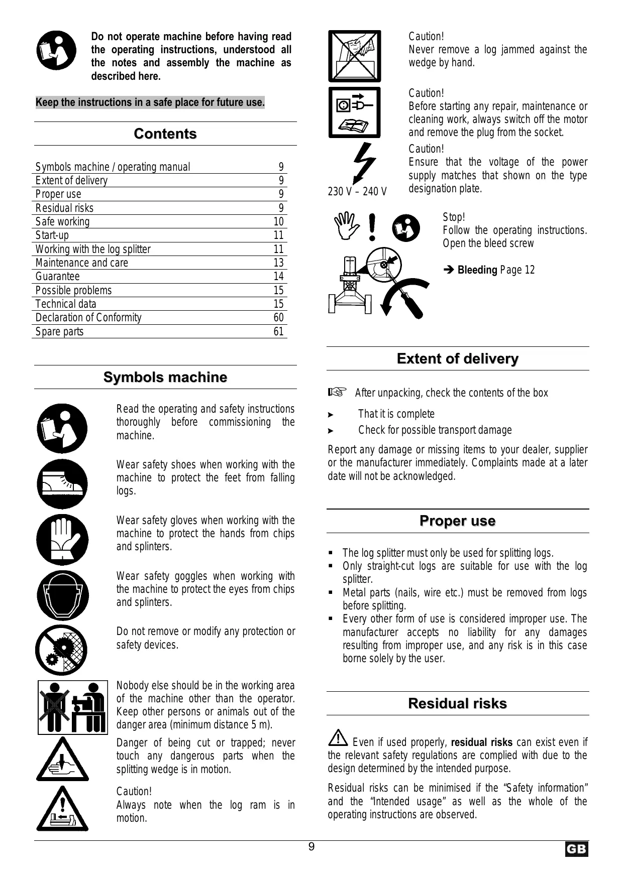 Do not operate machine before having read the operating instructions, understood all the notes and assembly the machine as described here. Caution! Never remove a log jammed against the wedge by hand. Keep the instructions in a safe place for future use. Contents Symbols machine / operating manual Extent of delivery Proper use Residual risks Safe working Start-up Working with the log splitter Maintenance and care Guarantee Possible problems Technical data Declaration of Conformity Spare parts