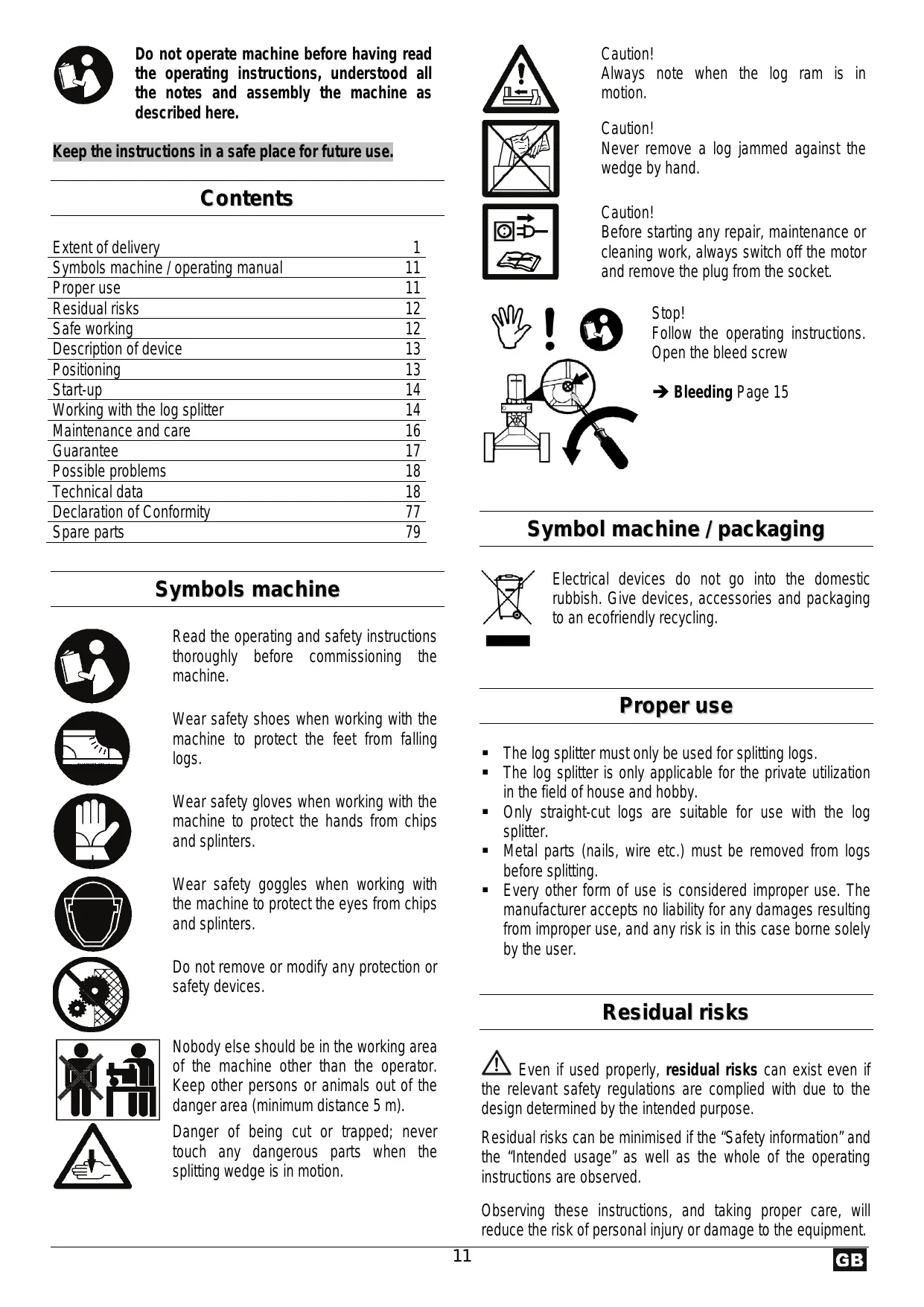 Do not operate machine before having read the operating instructions, understood all the notes and assembly the machine as described here. Caution! Always note when the log ram is in motion. Caution! Never remove a log jammed against the wedge by hand. Keep the instructions in a safe place for future use. Contents Extent of delivery Symbols machine / operating manual Proper use Residual risks Safe working Description of device Positioning Start-up Working with the log splitter Maintenance and care Guarantee Possible problems Technical data Declaration of Conformity Spare parts Caution! Before starting any repair, maintenance or cleaning work, always switch off the motor and remove the plug from the socket.