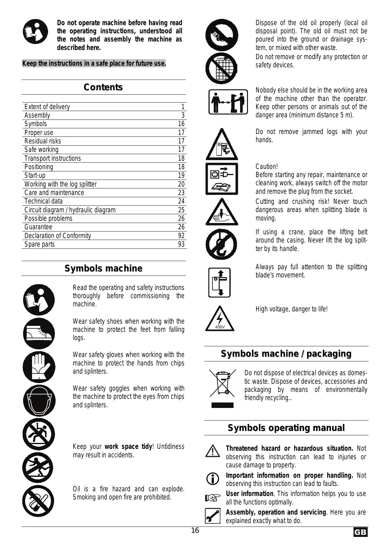 Do not operate machine before having read the operating instructions, understood all the notes and assembly the machine as described here. Dispose of the old oil properly (local oil disposal point). The old oil must not be poured into the ground or drainage system, or mixed with other waste. Do not remove or modify any protection or safety devices. Keep the instructions in a safe place for future use. Contents Extent of delivery Assembly Symbols Proper use Residual risks Safe working Transport instructions Positioning Start-up Working with the log splitter Care and maintenance Technical data Circuit diagram / hydraulic diagram Possible problems Guarantee Declaration of Conformity Spare parts Nobody else should be in the working area of the machine other than the operator. Keep other persons or animals out of the danger area (minimum distance 5 m).