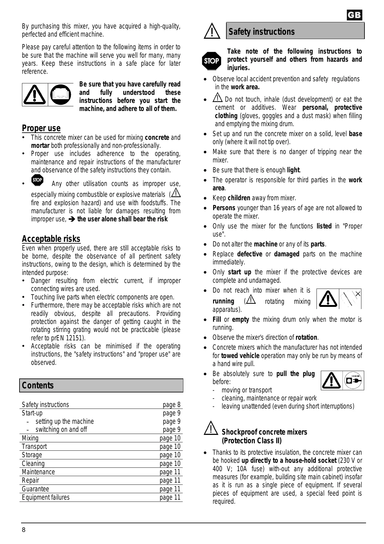 By purchasing this mixer, you have acquired a high-quality, perfected and efficient machine. Please pay careful attention to the following items in order to be sure that the machine will serve you well for many, many years. Keep these instructions in a safe place for later reference. Be sure that you have carefully read ( and fully understood these instructions before you start the machine, and adhere to all of them. Proper use + This concrete mixer can be used for mixing concrete and mortar both professionally and non-professionally. + Proper use includes adherence to the operating, maintenance and repair instructions of the manufacturer and observance of the safety instructions they contain. . [or] Any other utilisation counts as improper use, especially mixing combustible or explosive materials { fire and explosion hazard) and use with foodstuffs. The manufacturer is not liable for damages resulting from improper use, + the user alone shall bear the risk Acceptable risks Even when properly used, there are still acceptable risks to be borne, despite the observance of all pertinent safety instructions, owing to the design, which is determined by the intended purpose: + Danger resulting from electric current, if improper connecting wires are used. +. Touching live parts when electric components are open. + Furthermore, there may be acceptable risks which are not readily obvious, despite all precautions. Providing protection against the danger of getting caught in the rotating stirring grating would not be practicable (please refer to prEN 12151). + Acceptable risks can be minimised if the operating instructions, the "safety instructions" and "proper use" are observed. /\ Safety instructions protect yourself and others from hazards and injuries. °_ Observe local accident prevention and safety regulations in the work area. © Take note of the following instructions to . À Do not touch, inhale (dust development) or eat the cement or additives. Wear personal, protective clothing (gloves, goggles and a dust mask) when filling and emptying the mixing drum. e Setup and run the concrete mixer on a solid, level base only (where it will not tip over). e Make sure that there is no danger of tripping near the mixer. < Be sure thatthere is enough light. < The operator is responsible for third parties in the work area. e Keep children away from mixer. <_ Persons younger than 16 years of age are not allowed to operate the mixer. e Only use the mixer for the functions listed in "Proper use".