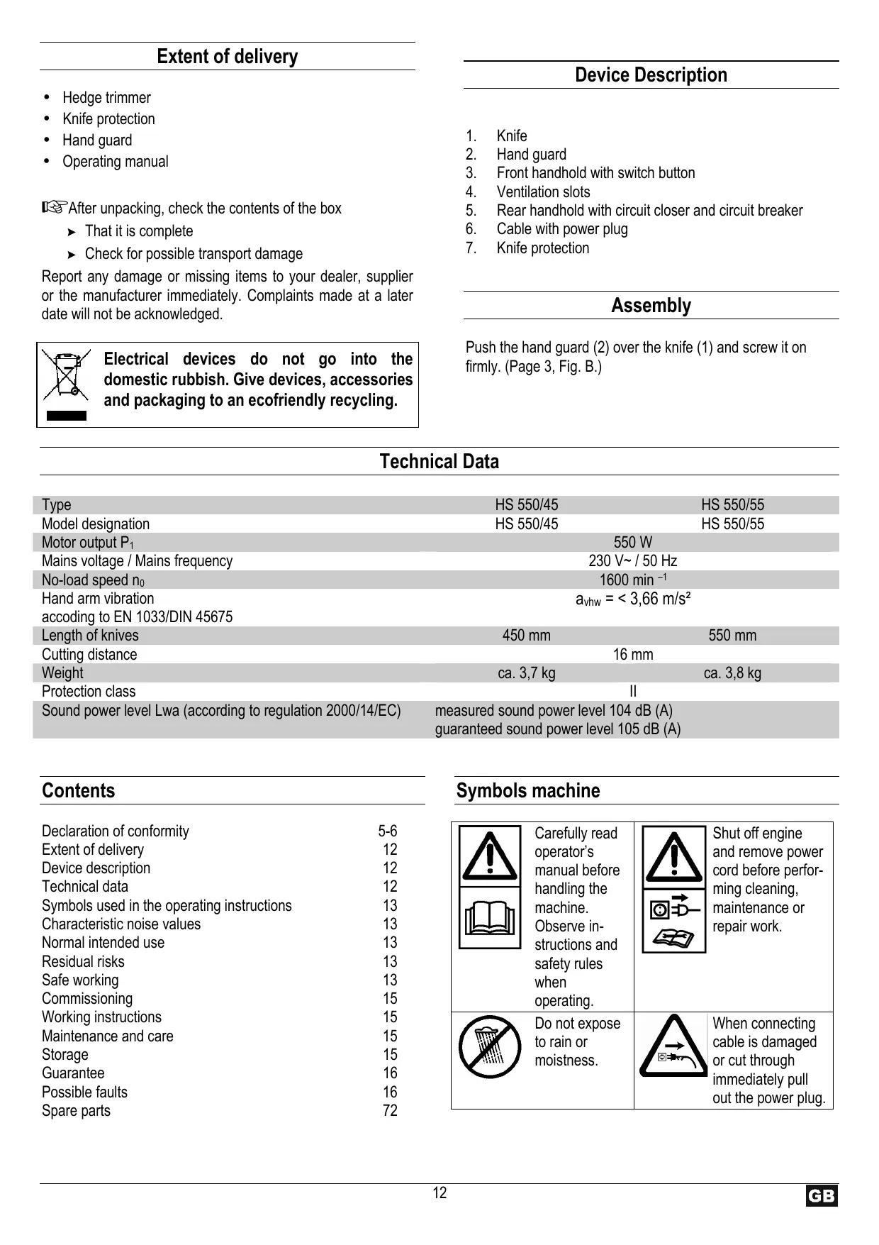 measured sound power level 104 dB (A) guaranteed sound power level 105 dB (A) Contents Declaration of conformity Extent of delivery Device description Technical data Symbols used in the operating instructions Characteristic noise values Normal intended use Residual risks Safe working Commissioning Working instructions Maintenance and care Storage Guarantee Possible faults Spare parts HS 550/55 HS 550/55 Symbols machine 5-6