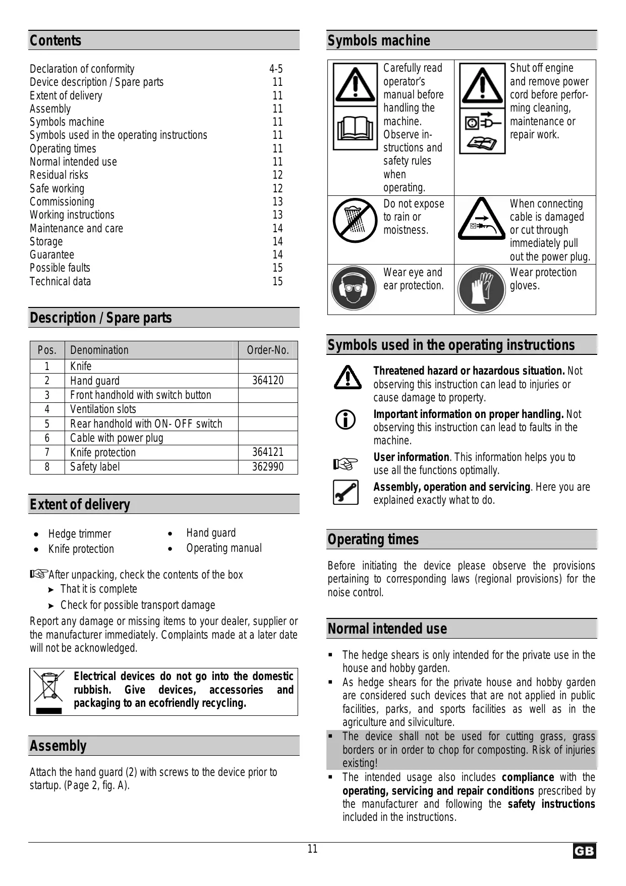 Normal intended use The hedge shears is only intended for the private use in the house and hobby garden. As hedge shears for the private house and hobby garden are considered such devices that are not applied in public facilities, parks, and sports facilities as well as in the agriculture and silviculture. The device shall not be used for cutting grass, grass borders or in order to chop for composting. Risk of injuries existing! The intended usage also includes compliance with the operating, servicing and repair conditions prescribed by the manufacturer and following the safety instructions included in the instructions.