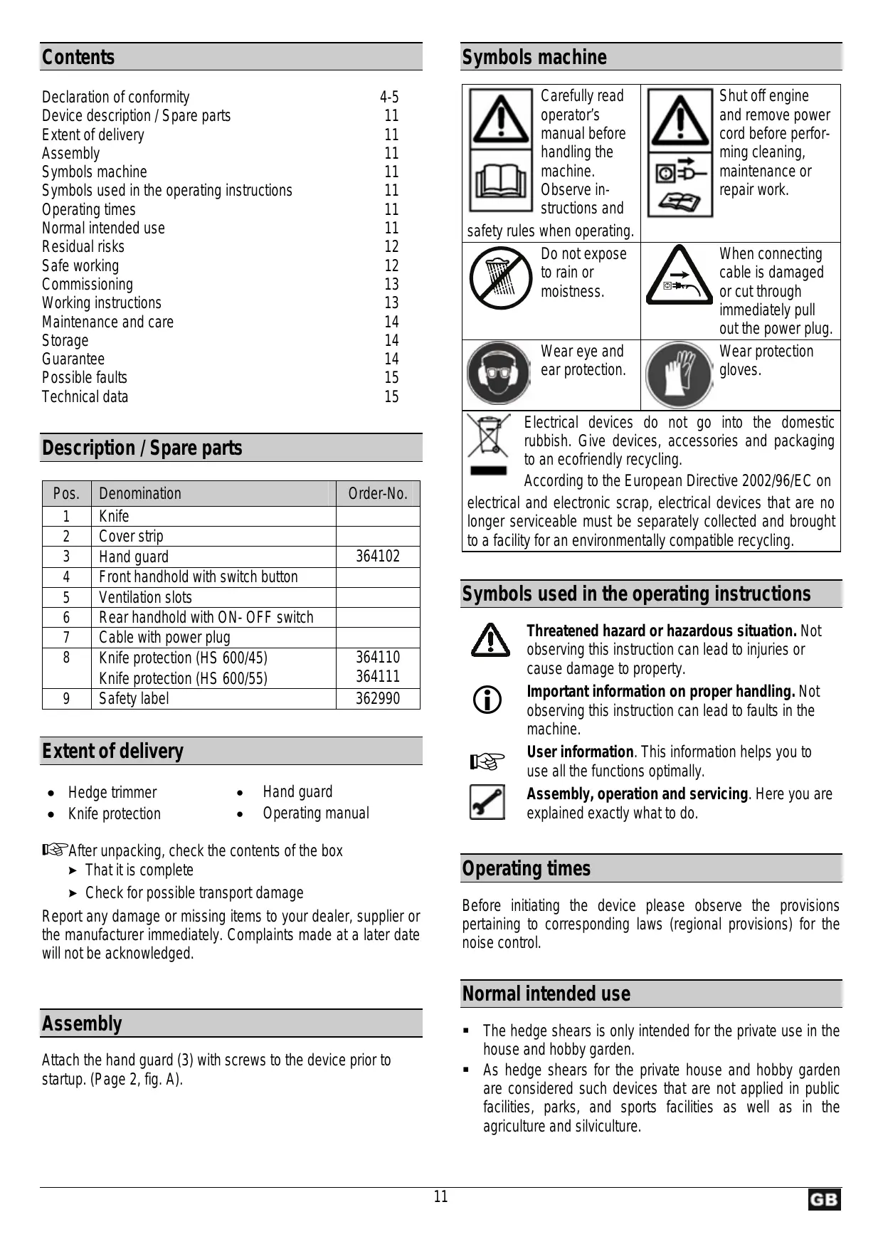 Shut off engine and remove power cord before performing cleaning, maintenance or repair work. Hand guard Operating manual After unpacking, check the contents of the box Threatened hazard or hazardous situation. Not observing this instruction can lead to injuries or cause damage to property. Important information on proper handling. Not observing this instruction can lead to faults in the machine. User information. This information helps you to use all the functions optimally. Assembly, operation and servicing. Here you are explained exactly what to do. Operating times ! That it is complete ! Check for possible transport damage Report any damage or missing items to your dealer, supplier or the manufacturer immediately. Complaints made at a later date will not be acknowledged. Before initiating the device please observe the provisions pertaining to corresponding laws (regional provisions) for the noise control. Normal intended use Assembly The hedge shears is only intended for the private use in the house and hobby garden. As hedge shears for the private house and hobby garden are considered such devices that are not applied in public facilities, parks, and sports facilities as well as in the agriculture and silviculture. Attach the hand guard (3) with screws to the device prior to startup. (Page 2, fig. A).