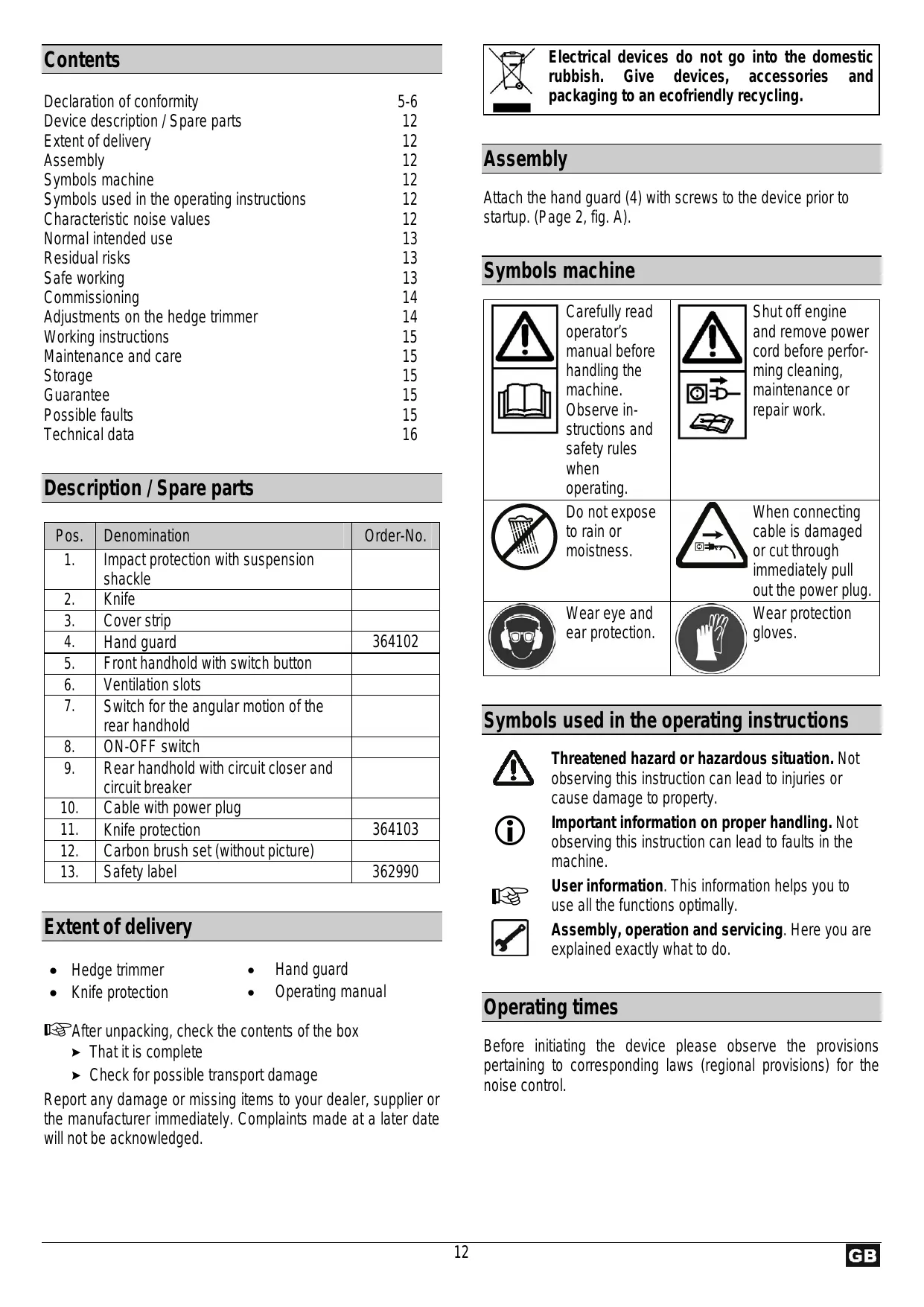 Electrical devices do not go into the domestic rubbish. Give devices, accessories and packaging to an ecofriendly recycling. Contents Declaration of conformity Device description / Spare parts Extent of delivery Assembly Symbols machine Symbols used in the operating instructions Characteristic noise values Normal intended use Residual risks Safe working Commissioning Adjustments on the hedge trimmer Working instructions Maintenance and care Storage Guarantee Possible faults Technical data 5-6