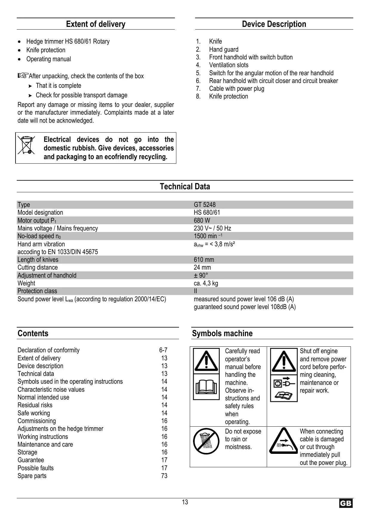 GT 5248 HS 680/61 680 W 230 V~ / 50 Hz 1500 min –1 avhw = < 3,8 m/s²