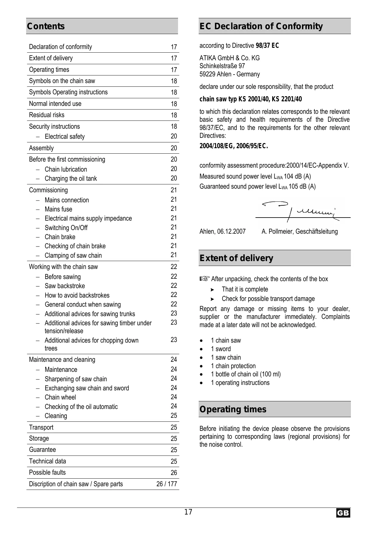 KS 2201 - Chain saw ATIKA - Free user manual and instructions