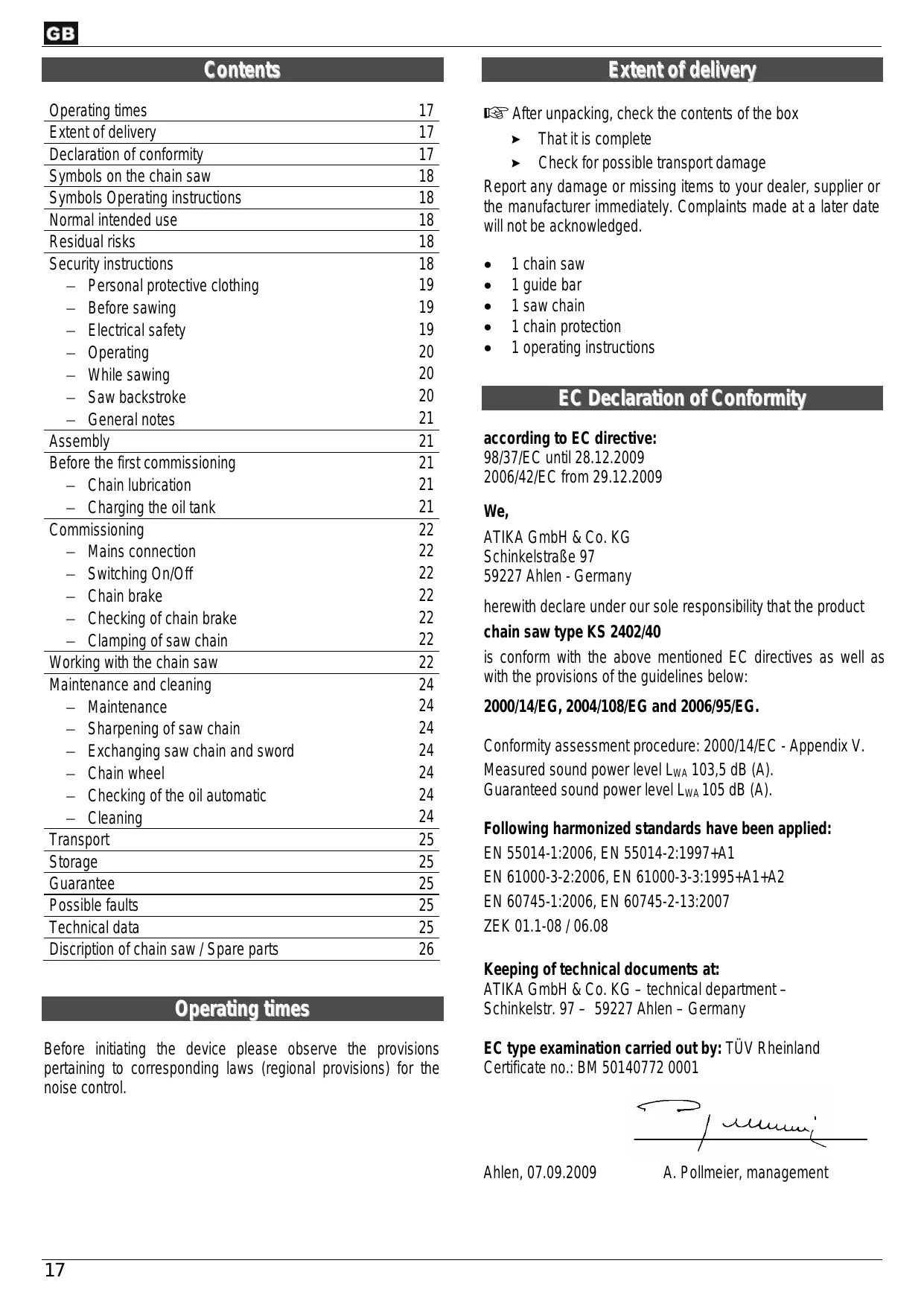 KS 2402-40 - Chain saw ATIKA - Free user manual and instructions