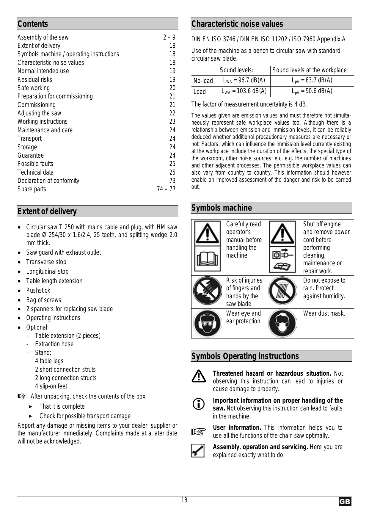 Contents Assembly of the saw Extent of delivery Symbols machine / operating instructions Characteristic noise values Normal intended use Residual risks Safe working Preparation for commissioning Commissioning Adjusting the saw Working instructions Maintenance and care Transport Storage Guarantee Possible faults Technical data Declaration of conformity Spare parts