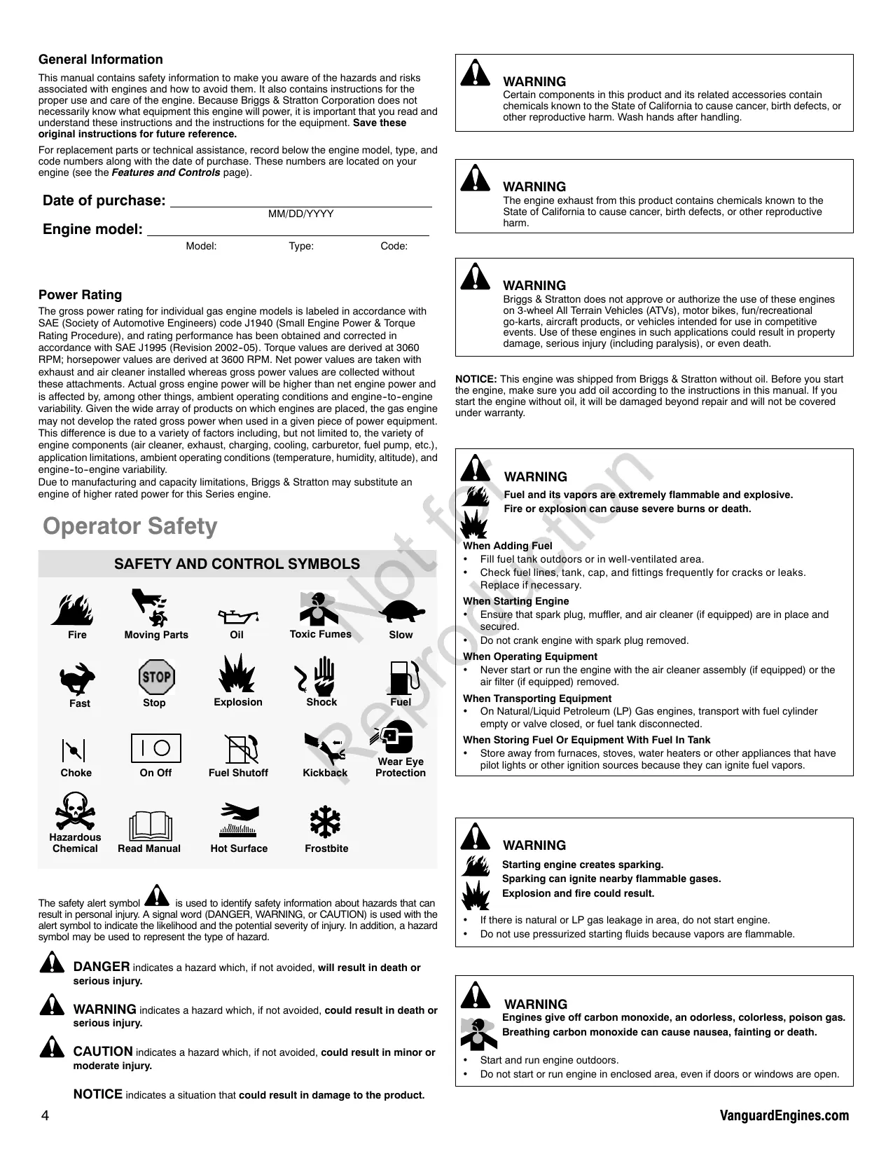Start and run engine outdoors. Do not start or run engine in enclosed area, even if doors or windows are open. VanguardEngines.com NOTICE: This engine was shipped from Briggs & Stratton without oil. Before you start the engine, make sure you add oil according to the instructions in this manual. If you start the engine without oil, it will be damaged beyond repair and will not be covered under warranty.
