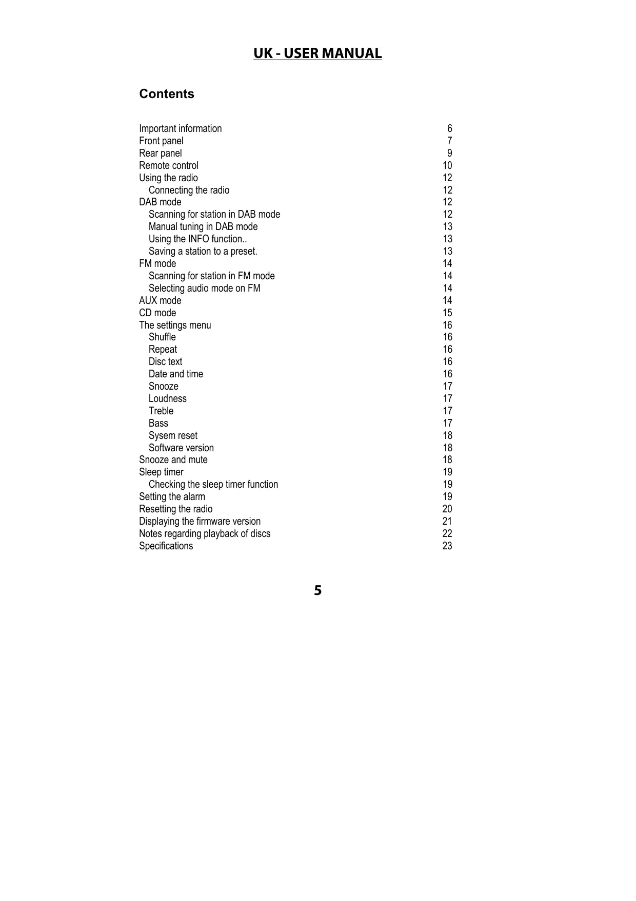 Contents Important information Front panel Rear panel Remote control Using the radio Connecting the radio DAB mode Scanning for station in DAB mode Manual tuning in DAB mode Using the INFO function.. Saving a station to a preset. FM mode Scanning for station in FM mode Selecting audio mode on FM AUX mode CD mode The settings menu Shuffle Repeat Disc text Date and time Snooze Loudness Treble Bass Sysem reset Software version Snooze and mute Sleep timer Checking the sleep timer function Setting the alarm Resetting the radio Displaying the firmware version Notes regarding playback of discs Specifications