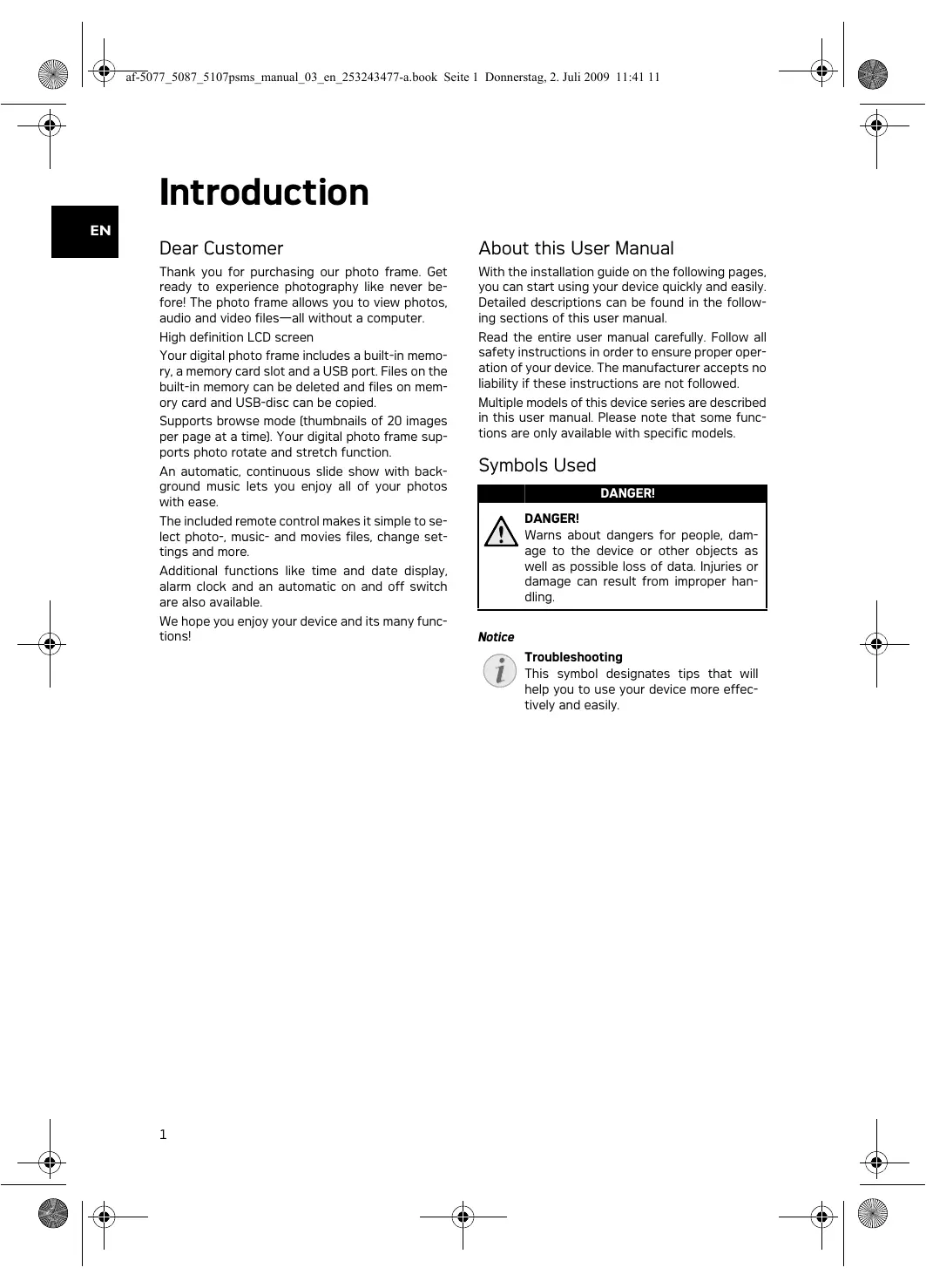 Packing Contents Digital photo frame ‚ Digital photo frame with bracket Power supply with exchangeable plugs 4 If the connection with the computer is disconnected, the digital photoframe will restart automatically. ƒ Power supply with exchangeable plugs Remote control (with battery) Variable „ A remote control (with battery) (AF¦5077/¦5087/5107MS) User Guide (not depicted) User Guide (not depicted) Verpackungsinhalt AF 5077 Inserting a Memory Card 1 Insert a memory card into the appropriate card slot at the rear of the device. Your photo frame supports the following memory cards: SD/ MMC/MS/SDHC/XD. DANGER! Inserting a Memory Card! Only use storage media that are compatible with the device. Missing Package Contents Never pull out the memory card while the device is accessing it. This could cause data to be damaged or lost. Notice Missing Package Contents If one of the parts is missing or damaged, please contact your retailer or our customer service. Connecting power supply Mains Voltage at the Site of Installation CAUTION! Mains Voltage at the Site of Installation! Check whether the mains voltage of your device (indicated on the type label) matches the mains voltage available at the setup location. 1 Choose the right plug for your country and slide it onto the power adapter. Ensure that the plug snaps in completely. 2 Insert the small plug of the power supply into the socket on the rear side of your device. Insert the power supply unit into the socket. Connecting to the PC 2 Switch the device on using the on/off switch on the rear. The player will start slide show after the start screen be displayed. Notice Many Photos on the Memory Card If the memory card contains many photos, it can take some time until the slide show starts. 3 Press OK at the rear during a slide show to stop the slide show. Notice Using USB device and memory card at the same time If a USB storage device is used at the same time as a storage card, the images from the memory card are displayed first. Using the USB cable, you can connect your photo frame to a computer to transfer files between the internal memory and computer. 1 Switch the device off using the on/off switch on the rear. 2 With the frame turned off, connect the small end of the cable to the digital picture frame and the large end to your computer. 3 Switch the device on using the on/off switch on the rear. Allow the computer a few moments to recognize the new hardware. Compatible photo, music and video files can be copied onto the internal memory.