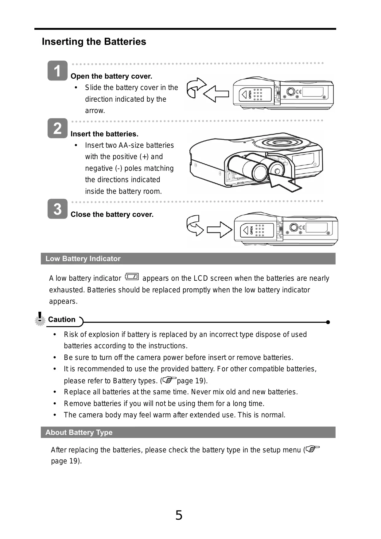 The battery life can be affected by soiling. Please clean the contacts with a clean and dry cloth before putting the batteries in the camera. Battery performance drops at temperatures below 5^ C (41^ F). If you use the camera at low temperatures you should have replacement batteries to hand and ensure they do not get too cold. Please note: you should not dispose of cold and seemingly flat batteries because these batteries may work again at room temperature.