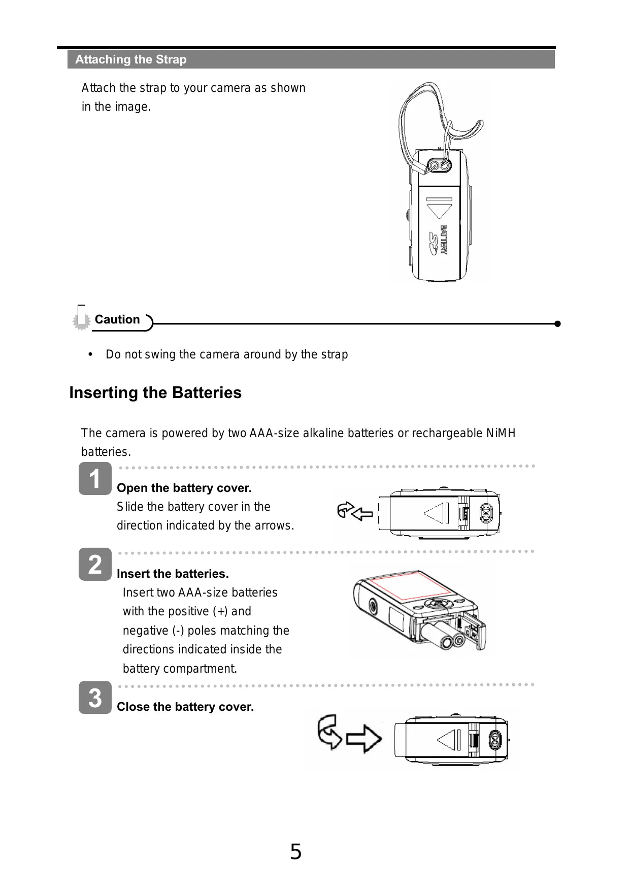 Attaching the Strap Attach the strap to your camera as shown in the image. L Caution . + Do notswing the camera around by the strap Inserting the Batteries The camera is powered by two AAA-size alkaline batteries or rechargeable NiMH batteries.