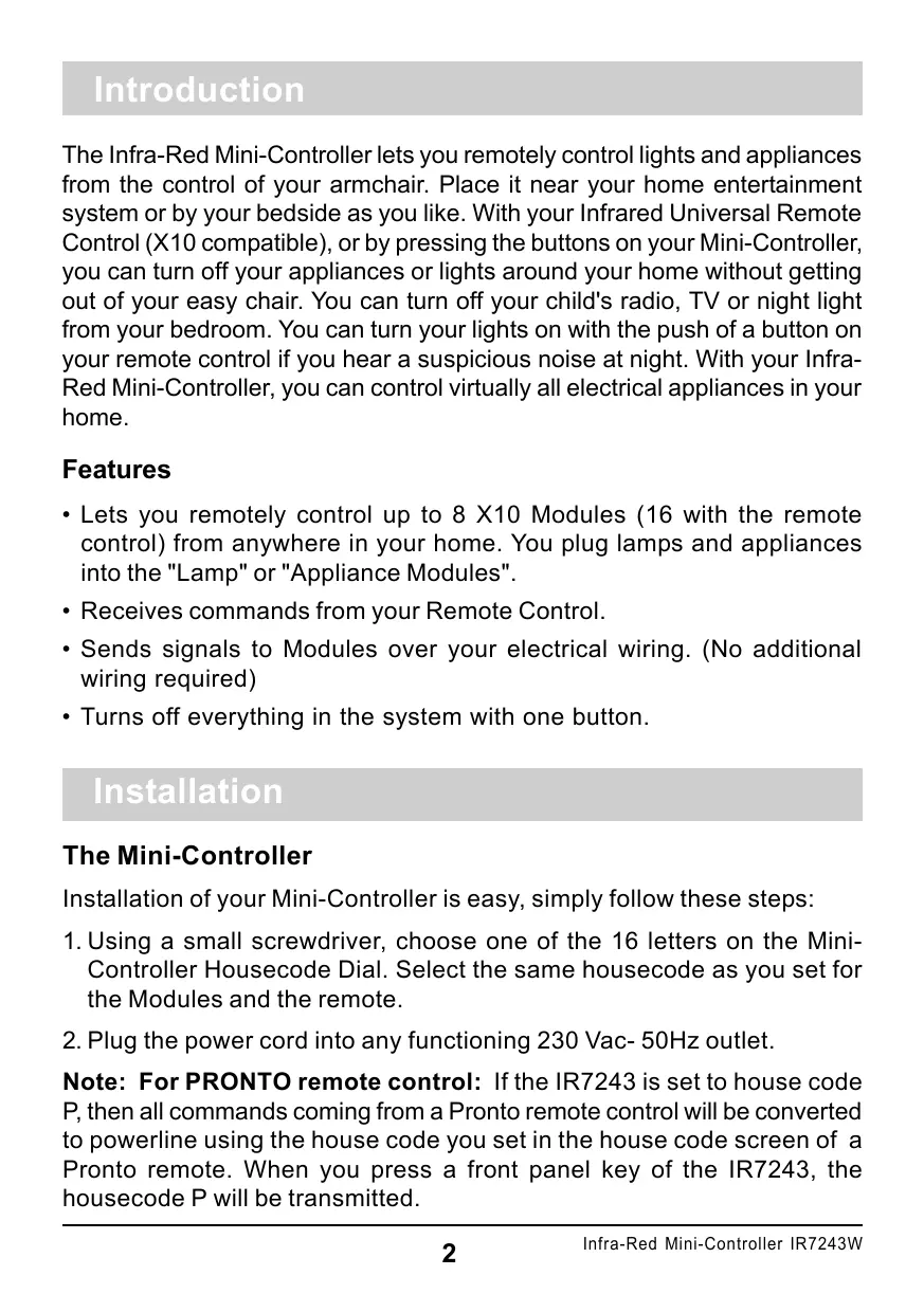 Du Mini-Contrôleur L'installation de votre Mini-Contrôleur Infra-Rouge est simple. Suivez la procédure suivante: 1. Grâce à un petit tournevis, sélectionnez une des 16 lettres sur le sélecteur du code maison, situé en haut à droite du Mini-Contrôleur. Choisissez le même Code Maison que pour les Modules "Appareil"ou "Lampe" ainsi que pour la télécommande. 2. Branchez-le dans une prise 230 Volts - 50 Hz.