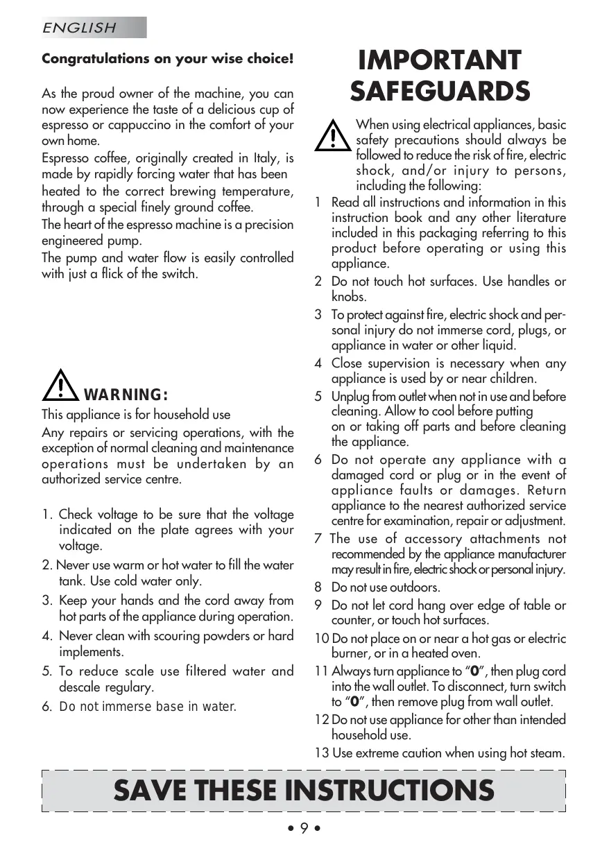 This appliance is for household use Any repairs or servicing operations, with the exception of normal cleaning and maintenance operations must be undertaken by an authorized service centre. 1. Check voltage to be sure that the voltage indicated on the plate agrees with your voltage. 2. Never use warm or hot water to fill the water tank. Use cold water only. 3. Keep your hands and the cord away from hot parts of the appliance during operation. 4. Never clean with scouring powders or hard implements. 5. To reduce scale use filtered water and descale regulary. 6. Do not immerse base in water.
