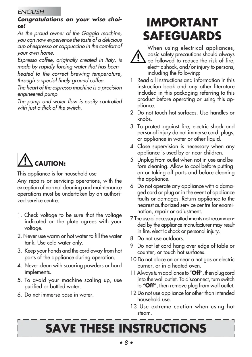 1 Lire toutes les instructions et les indications données dans cette brochure, ainsi que toute autre information sur l’emballage, avant de mettre la machine en marche. 2 Ne pas toucher les surfaces chaudes de la machine. 3 Ne pas plonger le fil électrique, la prise ou l’appareil lui-même dans de l’eau ou tout autre liquide. 4 Faire très attention lorsque l’appareil est utilisé par ou près des enfants.