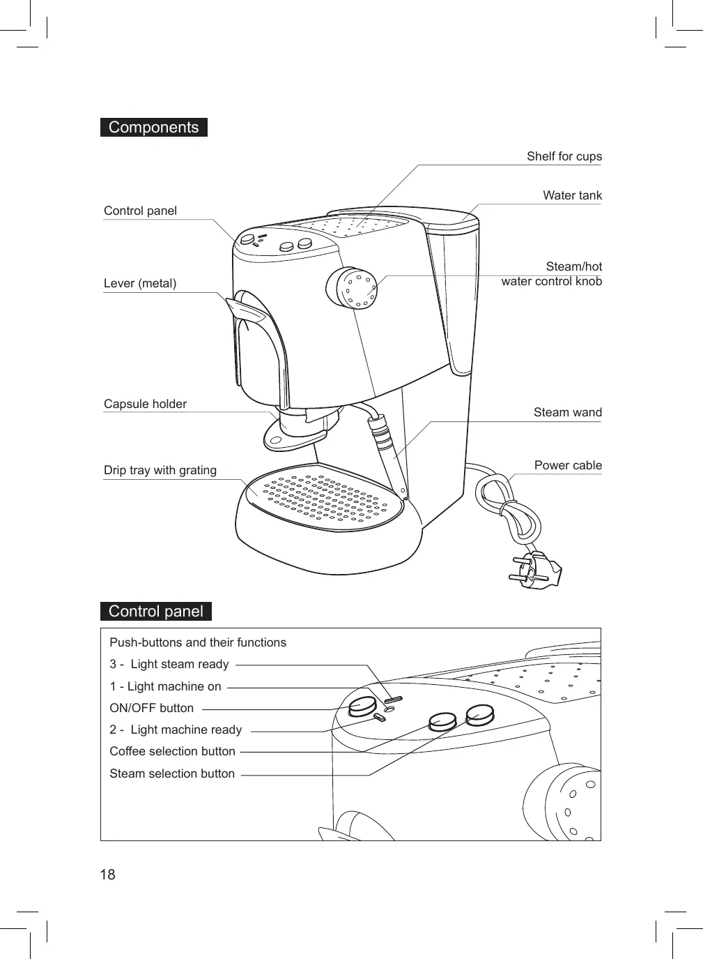 Cette fonction est utile pour la préparation du thé, des infusions et des boissons chaudes. • Enfoncer la touche ON/OFF pour allumer la machine. Le témoin machine allumée (1) s’allume. Quand le témoin machine prête (2) cesse de clignoter, la machine est prête à l’emploi. • Installer un récipient adéquat sous le gicleur de vapeur. Tourner le bouton lentement dans le sens contraire aux aiguilles d’une montre et enfoncer la touche de distribution de café (dessin 18). De l’eau chaude sortira du gicleur de vapeur. • Lorsque la quantité désirée aura été produite, arrêter la fonction en enfonçant de nouveau la touche de distribution de café et puis tourner le bouton complètement dans le sens des aiguilles d’une montre. Note: La machine possède un système électronique évolué qui commande les multiples fonctions de production du café et de la vapeur. Pour éviter des mauvais fonctionnements, ne pas rallumer la machine immédiatement après l’avoir éteinte, mais attendre environ 10 secondes avant de procéder. Respecter en outre le mode d’emploi.