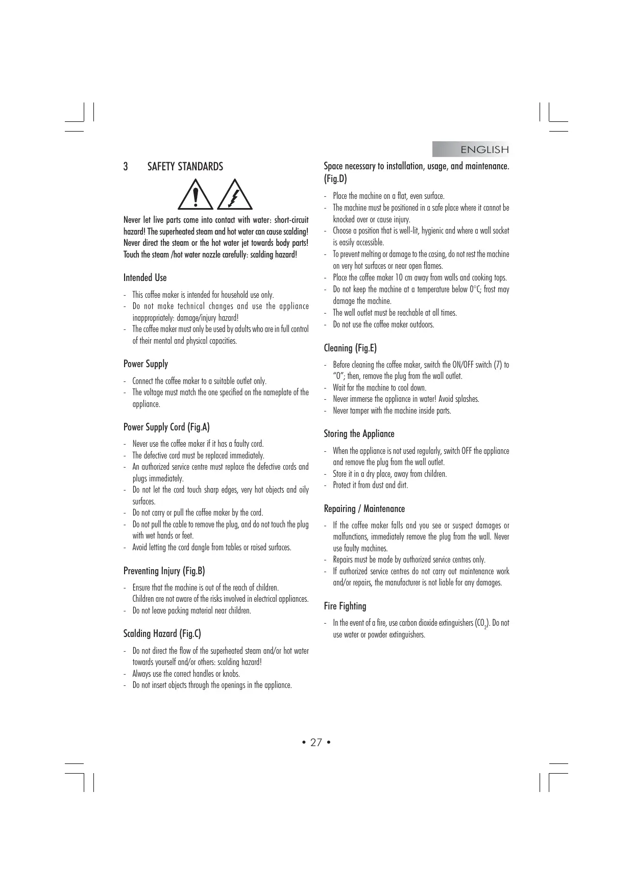 SAFETY STANDARDS Never let live parts come into contact with water: short-circuit hazard! The superheated steam and hot water can cause scalding!