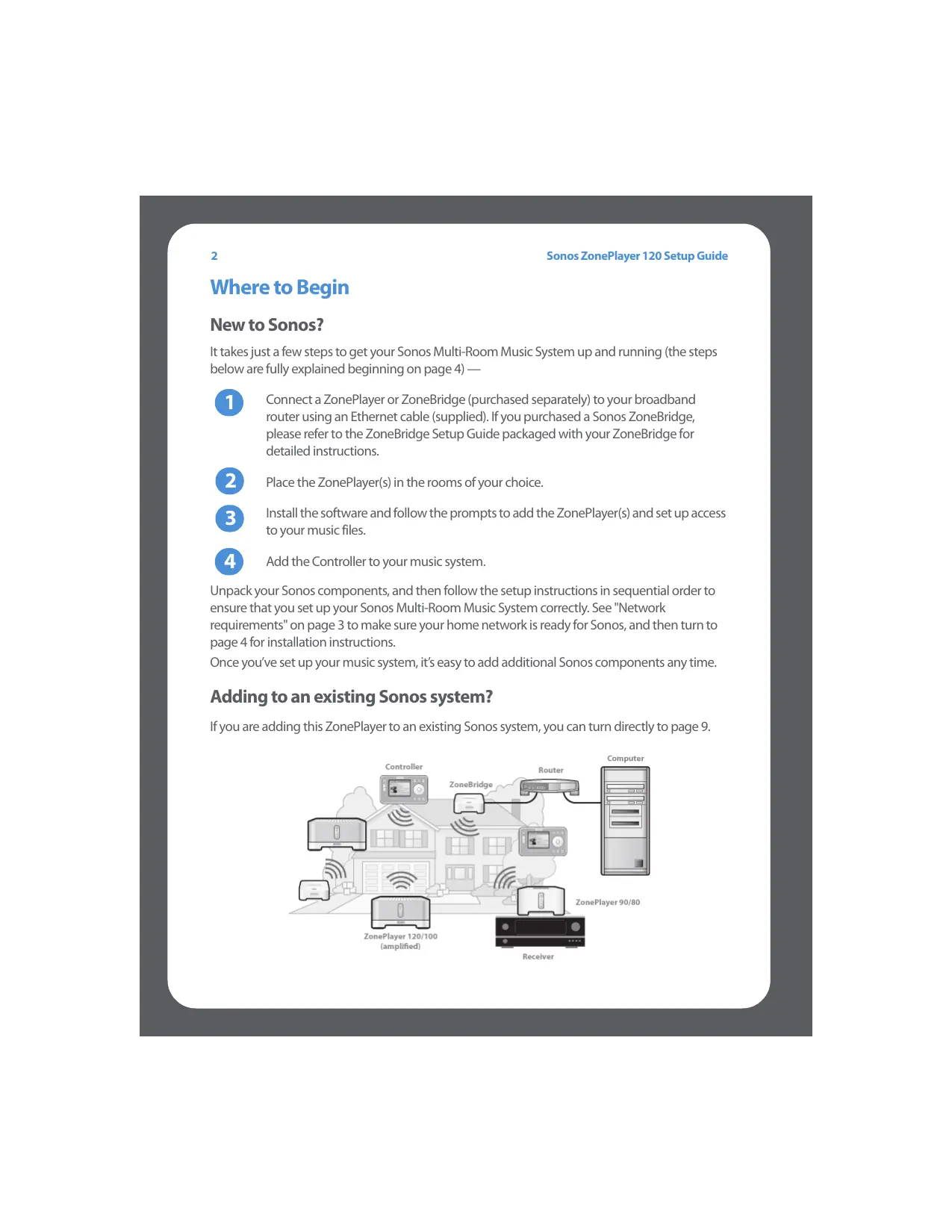 Sonos ZonePlayer 120 Setup Guide Where to Begin New to Sonos? It takes just a few steps to get your Sonos Multi-Room Music System up and running (the steps below are fully explained beginning on page 4) —