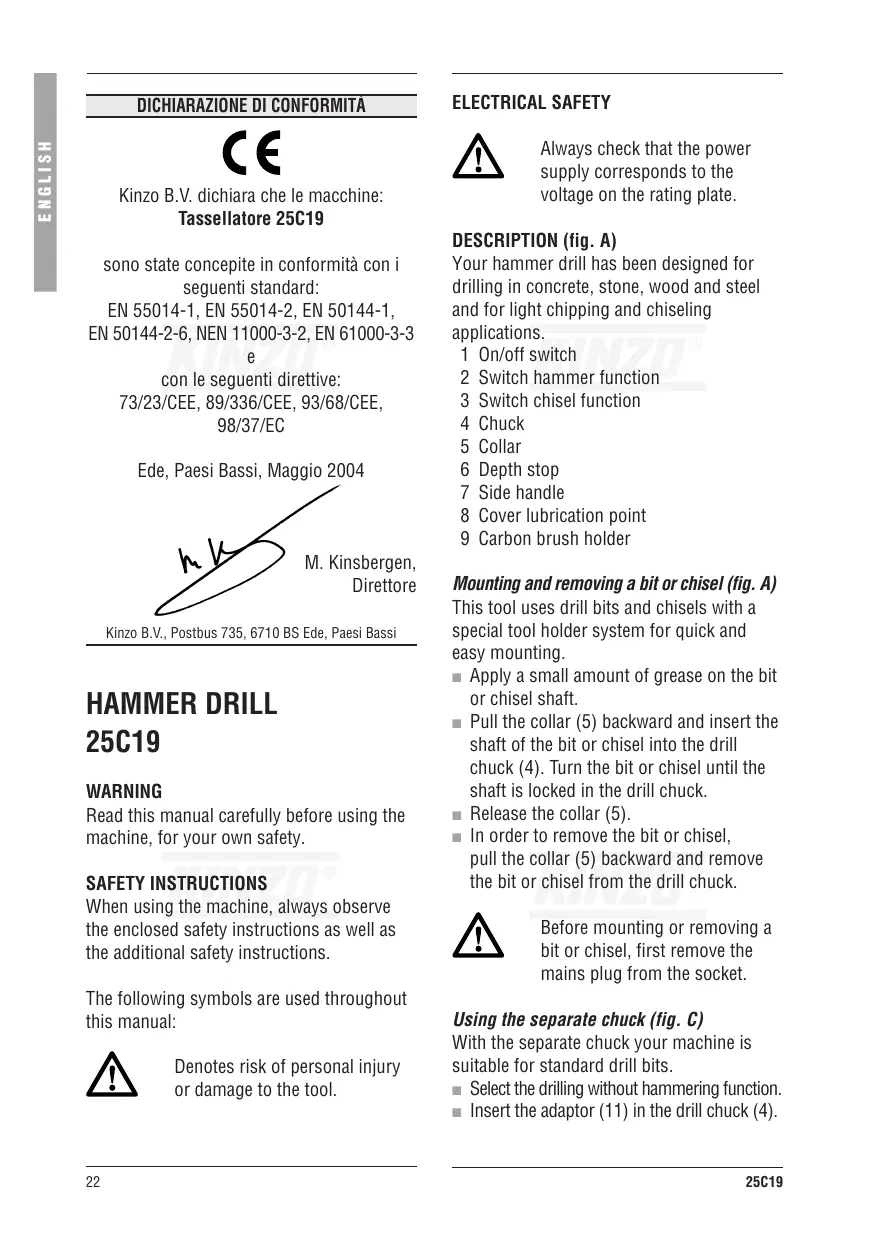 M. Kinsbergen, Director Kinzo B.V., Postbus 735, 6710 BS Ede, Holanda HAMMER DRILL 25C19 WARNING Read this manual carefully before using the machine, for your own safety. SAFETY INSTRUCTIONS When using the machine, always observe the enclosed safety instructions as well as the additional safety instructions. The following symbols are used throughout this manual: Denotes risk of personal injury or damage to the tool.