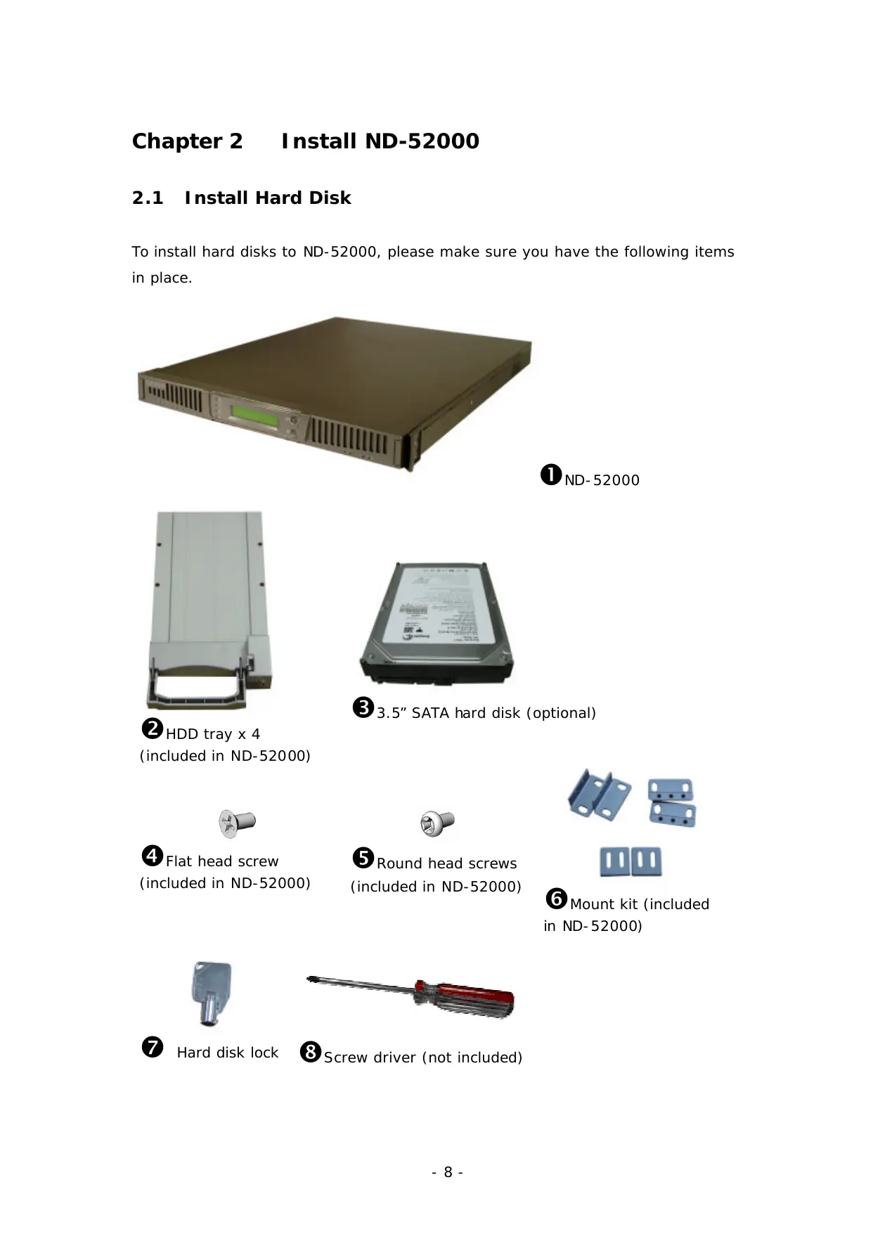 To install hard disks to ND-52000, please make sure you have the following items in place. Ov. 52000 6: SATA hard disk (optional) + WE [4 DER head screw Oround head screws tft} (included in ND-52000) (included in ND-52000) Oo tray x 4 (included in ND-52000) @ mount kit (included in ND-52000) ——.2s © Hard disk lock Oscrew driver (not included)