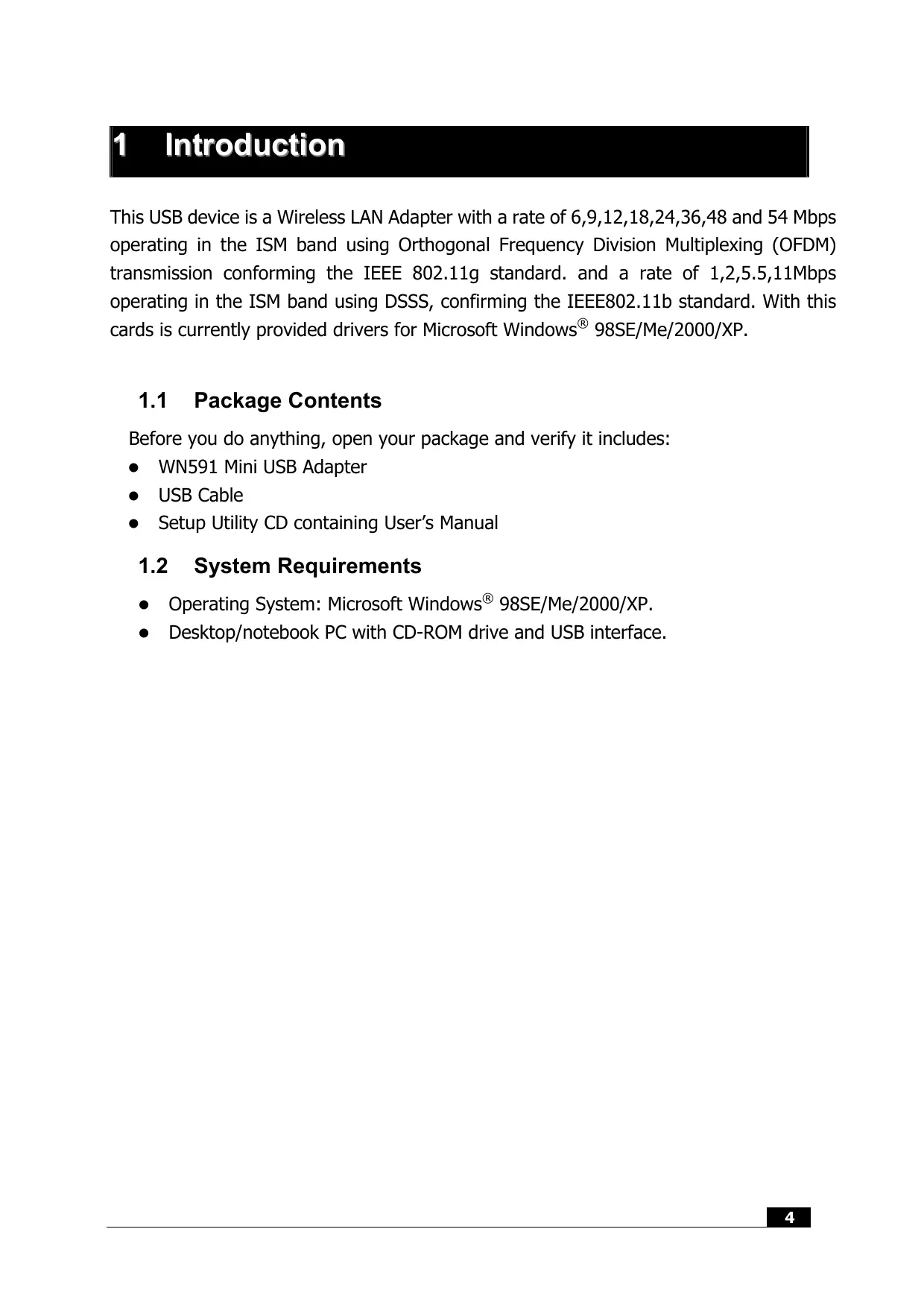 1 Introduction This USB device is a Wireless LAN Adapter with a rate of 6,9,12,18,24,36,48 and 54 Mbps operating in the ISM band using Orthogonal Frequency Division Multiplexing (OFDM) transmission conforming the IEEE 802.11g standard. and a rate of 1,2,5.5,11Mbps operating in the ISM band using DSSS, confirming the IEEE802.11b standard. With this cards is currently provided drivers for Microsoft Windows® 98SE/Me/2000/XP.