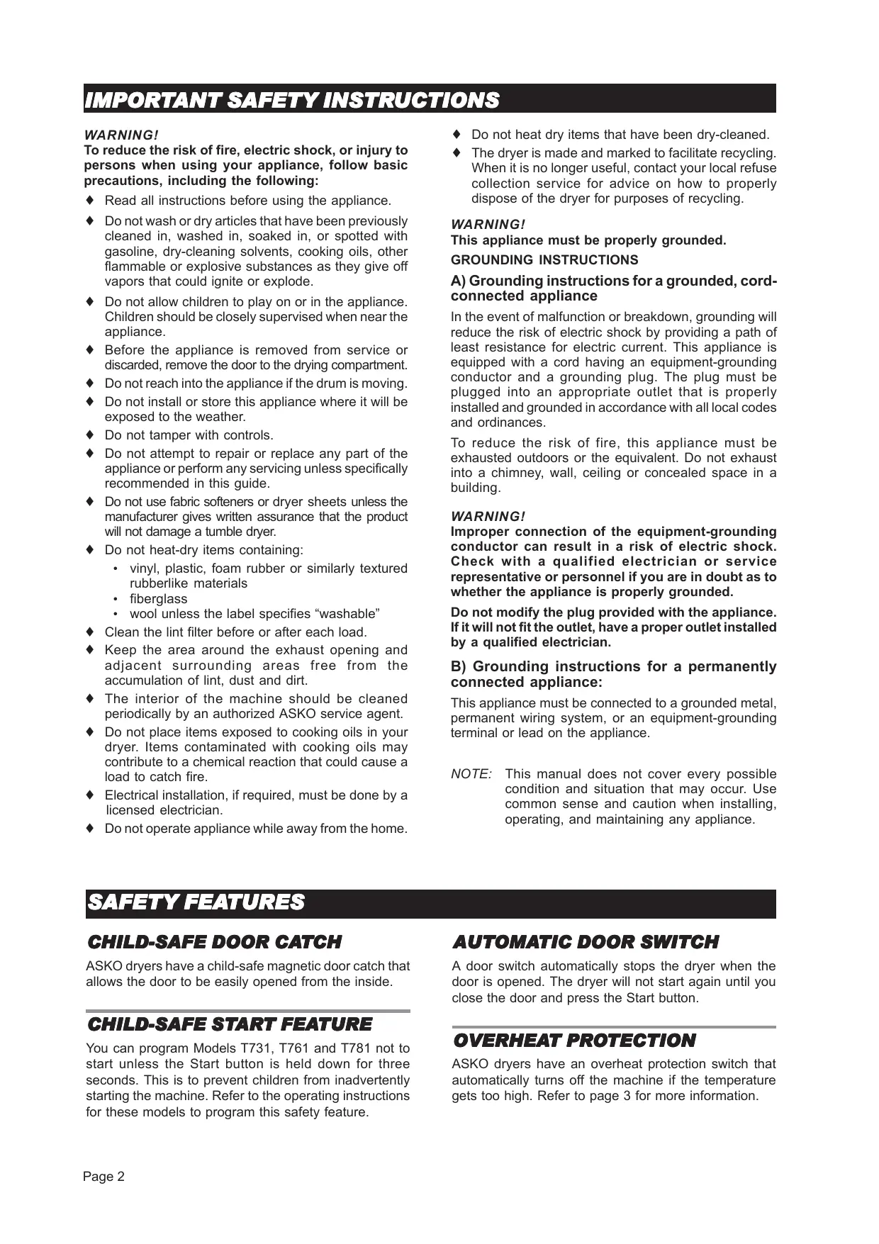 WARNING! To reduce the risk of fire, electric shock, or injury to persons when using your appliance, follow basic precautions, including the following: + Read all instructions before using the appliance. + Do not wash or dry articles that have been previously cleaned in, washed in, soaked in, or spotted with gasoline, dry-cleaning solvents, cooking oils, other flammable or explosive substances as they give off vapors that could ignite or explode. + Do not allow children to play on or in the appliance. Children should be closely supervised when near the appliance. + Before the appliance is removed from service or discarded, remove the door to the drying compartment. + Donotreachinto the appliance if the drum is moving. + Do not install or store this appliance where it will be exposed to the weather. + Do not tamper with controls. + Do not attempt to repair or replace any part of the appliance or perform any servicing unless specifically recommended in this guide. + Do not use fabric softeners or dryer sheets unless the manufacturer gives written assurance that the product Will not damage a tumble dryer. + Do not heat-dry items containing: +_ vinyl, plastic, foam rubber or similarly textured rubberlike materials + _fiberglass + wool unless the label specifies “washable” + Clean the lint filter before or after each load. + Keep the area around the exhaust opening and adjacent surrounding areas free from the accumulation of lint, dust and dirt. + The interior of the machine should be cleaned periodically by an authorized ASKO service agent. + Do not place items exposed to cooking oils in your dryer. Items contaminated with cooking oils may contribute to a chemical reaction that could cause a load to catch fire. + Electrical installation, if required, must be done by a licensed electrician. + Do not operate appliance while away from the home. + Do not heat dry items that have been dry-cleaned. + The dryer is made and marked to facilitate recycling. When it is no longer useful, contact your local refuse collection service for advice on how to properly dispose of the dryer for purposes of recycling. WARNING! This appliance must be properly grounded. GROUNDING INSTRUCTIONS A) Grounding instructions for a grounded, cord- connected appliance In the event of malfunction or breakdown, grounding will reduce the risk of electric shock by providing a path of least resistance for electric current. This appliance is equipped with a cord having an equipment-grounding conductor and a grounding plug. The plug must be plugged into an appropriate outlet that is properly installed and grounded in accordance with all local codes and ordinances. To reduce the risk of fire, this appliance must be exhausted outdoors or the equivalent. Do not exhaust into a chimney, wall, ceiling or concealed space in a building. WARNING! Improper connection of the equipment-grounding conductor can result in a risk of electric shock. Check with a qualified electrician or service representative or personnel if you are in doubt as to whether the appliance is properly grounded. Do not modify the plug provided with the appliance. Ifit will not fit the outlet, have a proper outlet installed by a qualified electrician. B) Grounding instructions for a permanently connected appliance: This appliance must be connected to a grounded metal, permanent wiring system, or an equipment-grounding terminal or lead on the appliance. NOTE: This manual does not cover every possible condition and situation that may occur. Use common sense and caution when installing, operating, and maintaining any appliance. SAFETY FEATURES