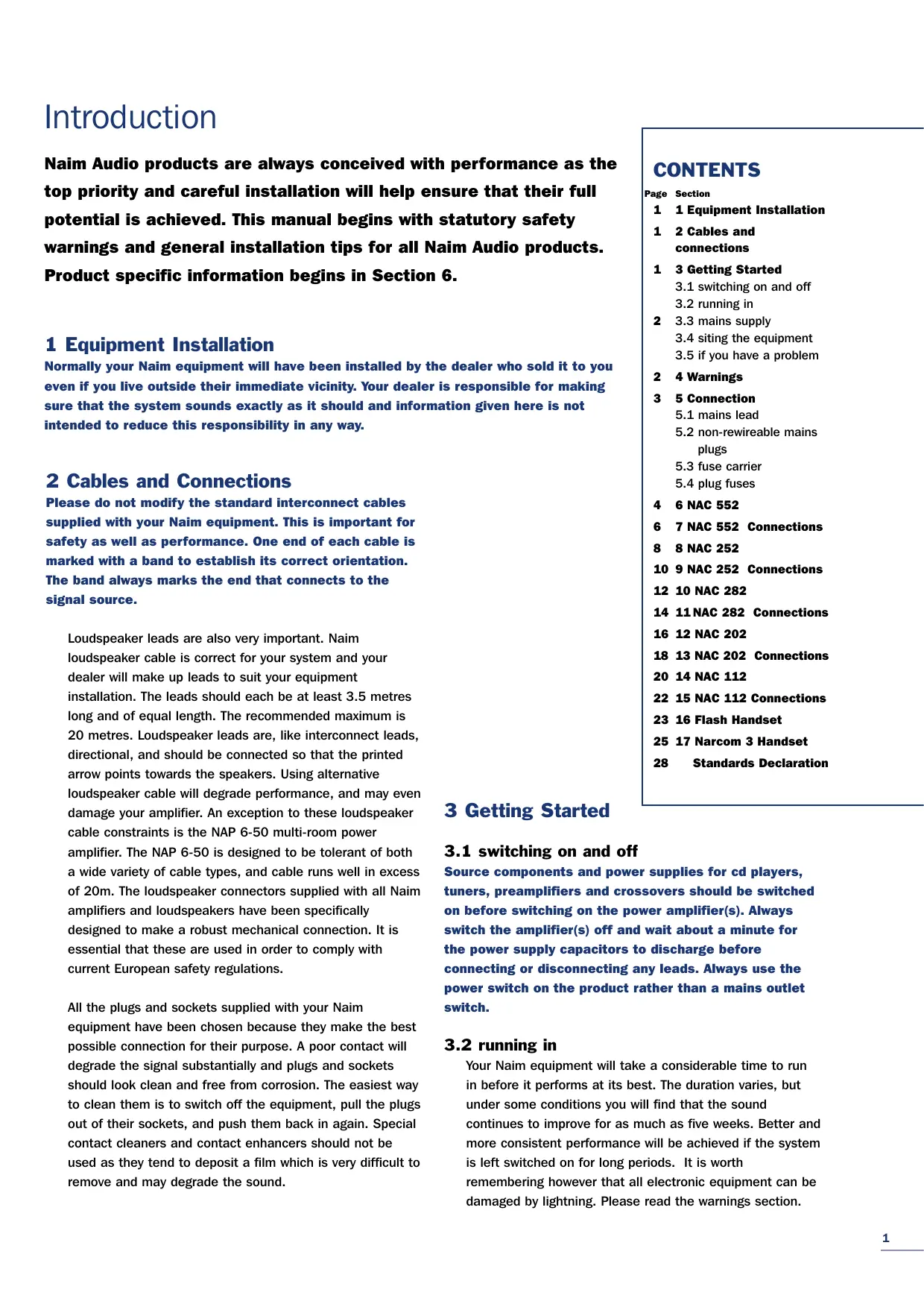 Naim Audio products are always conceived with performance as the top priority and careful installation will help ensure that their full potential is achieved. This manual begins with statutory safety warnings and general installation tips for all Naim Audio products. Product specific information begins in Section 6.