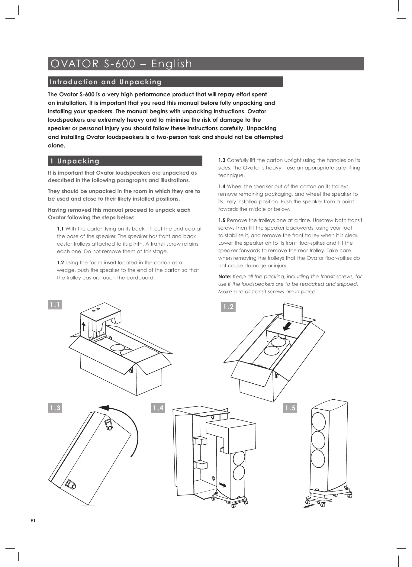 O VAT OR S-600 – E ng l i sh In t r odu c ti o n a nd Unp a cki ng The Ovator S-600 is a very high performance product that will repay effort spent on installation. It is important that you read this manual before fully unpacking and installing your speakers. The manual begins with unpacking instructions. Ovator loudspeakers are extremely heavy and to minimise the risk of damage to the speaker or personal injury you should follow these instructions carefully. Unpacking and installing Ovator loudspeakers is a two-person task and should not be attempted alone. 1 Un packi ng It is important that Ovator loudspeakers are unpacked as described in the following paragraphs and illustrations. They should be unpacked in the room in which they are to be used and close to their likely installed positions. Having removed this manual proceed to unpack each Ovator following the steps below: