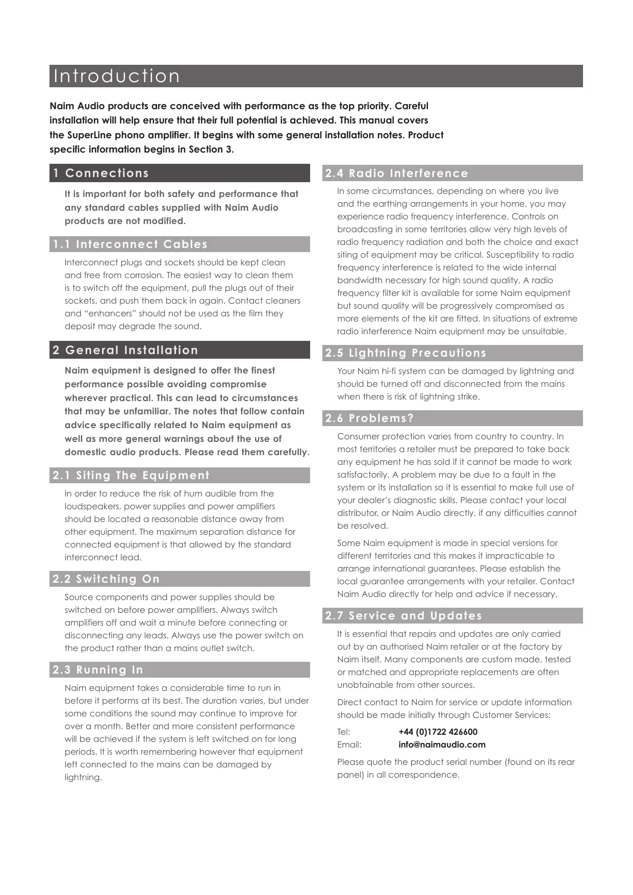 I ntrod u c tio n Naim Audio products are conceived with performance as the top priority. Careful installation will help ensure that their full potential is achieved. This manual covers the SuperLine phono amplifier. It begins with some general installation notes. Product specific information begins in Section 3. 1 Con n ect ions It is important for both safety and performance that any standard cables supplied with Naim Audio products are not modified.