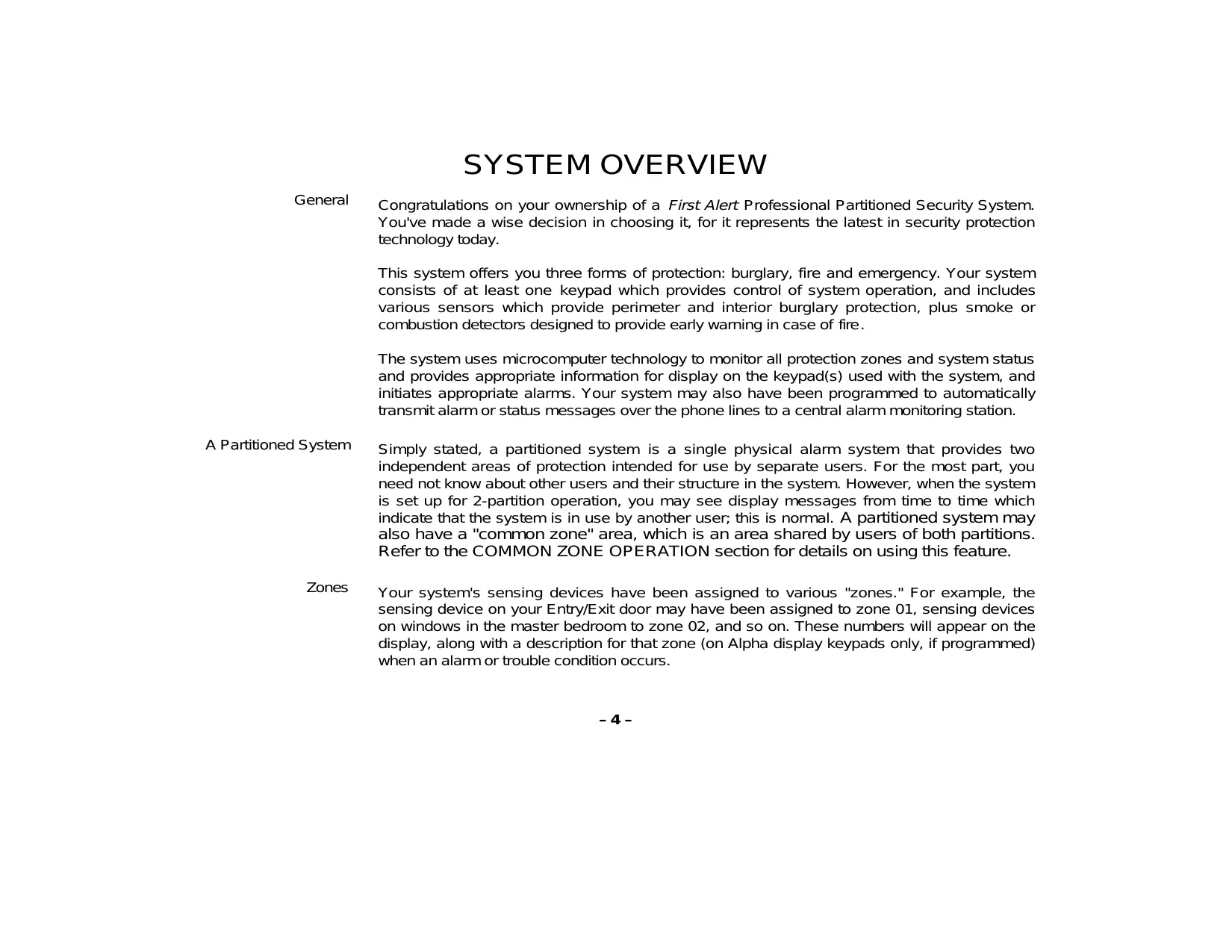 –3 – SYSTEM OVERVIEW General Congratulations on your ownership of a First Alert Professional Partitioned Security System. You've made a wise decision in choosing it, for it represents the latest in security protection technology today. This system offers you three forms of protection: burglary, fire and emergency. Your system consists of at least one keypad which provides control of system operation, and includes various sensors which provide perimeter and interior burglary protection, plus smoke or combustion detectors designed to provide early warning in case of fire . The system uses microcomputer technology to monitor all protection zones and system status and provides appropriate information for display on the keypad(s) used with the system, and initiates appropriate alarms. Your system may also have been programmed to automatically transmit alarm or status messages over the phone lines to a central alarm monitoring station. A Partitioned System Simply stated, a partitioned system is a single physical alarm system that provides two independent areas of protection intended for use by separate users. For the most part, you need not know about other users and their structure in the system. However, when the system is set up for 2-partition operation, you may see display messages from time to time which indicate that the system is in use by another user; this is normal. A partitioned system may also have a "common zone" area, which is an area shared by users of both partitions. Refer to the COMMON ZONE OPERATION section for details on using this feature. Zones Your system's sensing devices have been assigned to various "zones." For example, the sensing device on your Entry/Exit door may have been assigned to zone 01, sensing devices on windows in the master bedroom to zone 02, and so on. These numbers will appear on the display, along with a description for that zone (on Alpha display keypads only, if programmed) when an alarm or trouble condition occurs. –4 – SYSTEM OVERVIEW Burglary Protection Your system provides four modes of burglary protection: STAY, AWAY, INSTANT and MAXIMUM, and allows you to BYPASS selected zones while leaving the rest of the system armed. You must turn on or "arm" the burglary protection portion of your system before it will sense burglary alarms. The system also provides a CHIME mode, for alerting users to the opening of protected doors and windows while the system is disarmed. Refer to the other sections of this manual for procedures for using these features. The following table lists the four different arming modes and the results of each. Arming Mode AWAY STAY INSTANT MAXIMUM Exit Delay Yes Yes Yes Yes Features For Each Arming Mode Entry Delay Perimeter Armed Yes Yes