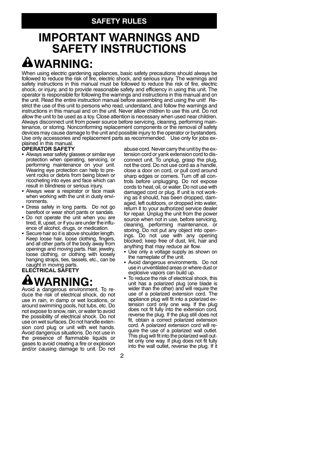 SAFETY INSTRUCTIONS A WARNING: When using electric gardening appliances, basic safety precautions should always be followed to reduce the risk of fre, electric shock, and serious injury. The wamings and safety instructions in this manual must be followed to reduce the risk of fire, electric Shock, or injury and to provide reasonable safety and eficiency in using this unit. The operator is responsible for following the wamings and instructions in this manual and on the unit. Read the entire instruction manual before assembling and using the unit! Re- strict the use of this unit to persons who read, understand, and follow the wamings and instructions in this manual and on the unit. Never allow children to use this unit. Do not allow the unit to be used as a toy. Close attention is necessary when used near children. Always disconnect unit from power source before servicing, cleaning, performing main- tenance, or storing. Nonconforming replacement components or the removal of safety. devices may cause damage to the unit and possible injury to the operator or bystanders. Use only accessories and replacement parts as recommended. Use only for jobs ex- plained in this manual. OPERATOR SAFETY + Always wear safety glasses or similar eye protection when operating, servicing, or performing maintenance on your unit. Wearing eye protection can help to pre- vent rocks or debris from being blown or ricocheting into eyes and face which can result in blindness or serious injury. + Always wear à respirator or face mask when working with the unit in dusty envi- ronments. Dress safely in long pants. Do not go barefoot or wear short pants or sandals. Do not operate the unit when you are tired, il, upset, or if you are under the influ- ence of alcohol, drugs, or medication. Secure hair so itis above shoulder length. Keep loose hair, loose clothing, fingers, and all other paris of the body away from openings and moving parts. Hair, jewelry, loose clothing, or clothing with loosely hanging straps, ties, tassels, etc. can be caught in moving parts. ELECTRICAL SAFETY A WARNING: Avoid a dangerous environment. To re- duce the risk of electrical shock, do not use in rain, in damp or wet locations, or around swimming pools, hot tubs, etc. Do not expose to snow, rain, orwater to avoid the possibilty of electrical shock. Do not use on wet surfaces. Do not handle exten- sion cord plug or unit with_wet hands. Avoid dangerous situations. Do not use in the presence of flammable liquids or gases to avoid creating a fire or explosion and/or causing damage to unit. Do not abuse cord. Never carry the unitby the ex- tension cord or yank extension cord to dis- connect unit. To unplug, grasp the plug, notthe cord. Do not use cord as a handle, close a door on cord, or pull cord around sharp edges or comers. Tum off all con- trols before unplugging. Do not expose cords to heat, oil, or water. Do not use with damaged cord or plug. f unit is not work- ing as it should, has been dropped, dam- aged, left outdoors, or dropped into water, return it to your authorized service dealer or repair. Unplug the unit from the power source when not in use, before servicing, cleaning, performing maintenance, or storing. Do not put any object into open- ings. Do not use with any opening blocked: keep free of dust, lint, hair and anything that may reduce air flow. + Use only a voltage supply as shown on the nameplate of the unit. + Avoid dangerous environments. Do not use in unventilated areas or where dust or explosive vapors can build Up. + To reduce the risk of electrical shock, this unit has a polarized plug (one blade is wider than the other) and will require the use of a polarzed extension cord. The appliance plug will ft into a polarized ex- tension cord only one way. If the plu does not fi fully into the extension cord, reverse the plug. fthe plug still does not fit. obtain a correct polarized extension cord. À polarized extension cord will re- quire the use of a polarized wall outlet. This plug wil ft into the polarized wall out- let only one way. If plug does not fit fully into the wall outlet, reverse the plug. If it