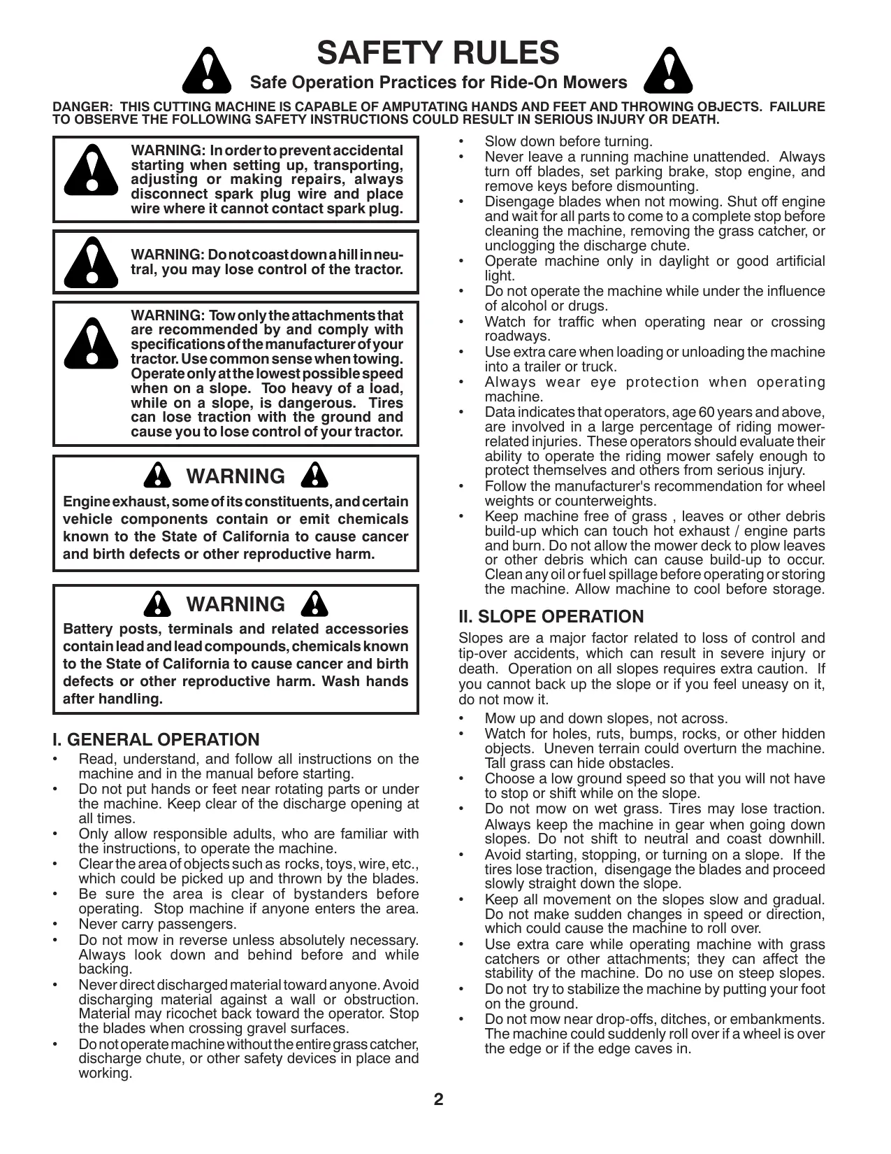 À WARNING À Engine exhaust, some ofits constituents, and certain vehicle components contain or emit chemicals known to the State of California to cause cancer and birth defects or other reproductive harm. À WARNING À Battery posts, terminals and related accessories contain lead andlead compounds, chemicals known to the State of California to cause cancer and birth defects or other reproductive harm. Wash hands after handling. . GENERAL OPERATION Read, understand, and follow all instructions on the machine and in the manual before starting. Do not put hands or feet near rotating parts or under the machine. Keep clear of the discharge opening at all times. Only allow responsible adults, who are familiar with the instructions, to operate the machine. Clearthe area of objects such as rocks, toys, wire, etc., which could be picked up and thrown by the blades. Be sure the area is clear of bystanders before operating. Stop machine if anyone enters the area. Never carry passengers. Do not mow in reverse unless absolutely necessary. Always look down and behind before and while backing. Never direct discharged material toward anyone. Avoid discharging material against a wall or obstruction. Material may ricochet back toward the operator. Stop the blades when crossing gravel surfaces. Donotoperate machine withoutthe entire grass catcher, discharge chute, or other safety devices in place and working. Slow down before turning. Never leave a running machine unattended. Always turn off blades, set parking brake, stop engine, and remove keys before dismounting. Disengage blades when not mowing. Shut off engine and wait for all parts to come to a complete stop before cleaning the machine, removing the grass catcher, or unclogging the discharge chute. Operate machine only in daylight or good artificial light. Do not operate the machine while under the influence of alcohol or drugs. Waich for traffic when operating near or crossing roadways. Use extra care when loading or unloading the machine into a trailer or truck. Always wear eye protection when operating machine. Data indicates that operators, age 60 years and above, are involved in a large percentage of riding mower- related injuries. These operators should evaluate their ability to operate the riding mower safely enough to protect themselves and others from serious injury. Follow the manufacturer's recommendation for wheel weighis or counterweighis. Keep machine free of grass , leaves or other debris build-up which can touch hot exhaust / engine parts and burn. Do not allow the mower deck to plow leaves or other debris which can cause build-up to occur. Clean any oil or fuel spillage before operating or storing the machine. Allow machine to cool before storage. Il. SLOPE OPERATION Slopes are a major factor related to loss of control and tip-over accidents, which can result in severe injury or death. Operation on all slopes requires extra caution. If you cannot back up the slope or if you feel uneasy on it, do not mow it. Movw up and down slopes, not across. Watch for holes, ruts, bumps, rocks, or other hidden objects. Uneven terrain could overturn the machine. Tall grass can hide obstacles. Choose a low ground speed so that you will not have to stop or shift while on the slope. Do not mow on wet grass. Tires may lose traction. Always keep the machine in gear when going down slopes. Do not shift to neutral and coast downhill. Avoid starting, stopping, or turning on a slope. lfthe tires lose traction, disengage the blades and proceed slowly straight down the slope. Keep all movement on the slopes slow and gradual. Do not make sudden changes in speed or direction, which could cause the machine to roll over. Use extra care while operating machine with grass caichers or other attachments; they can affect the stability of the machine. Do no use on steep slopes. Do not try to stabilize the machine by putting your foot on the ground. Do not mow near drop-offs, ditches, or embankments. The machine could suddenly roll over if a wheel is over the edge or if the edge caves in.