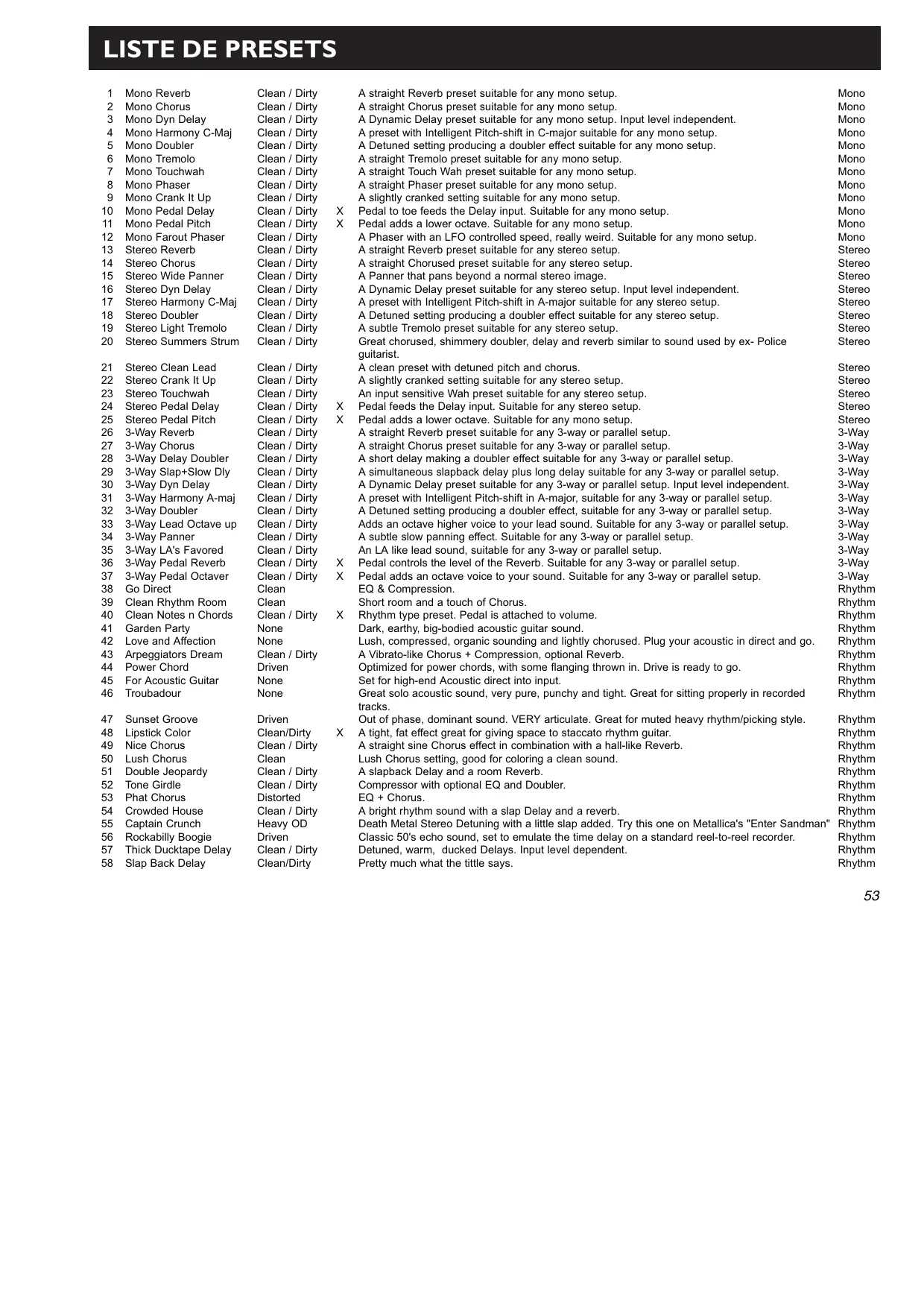 | 65 | Flange Yer Face | Clean / Dirty | All purpose Flanger, great for guitar and vocal effects. Super for acoustic guitar. | Rhythm |