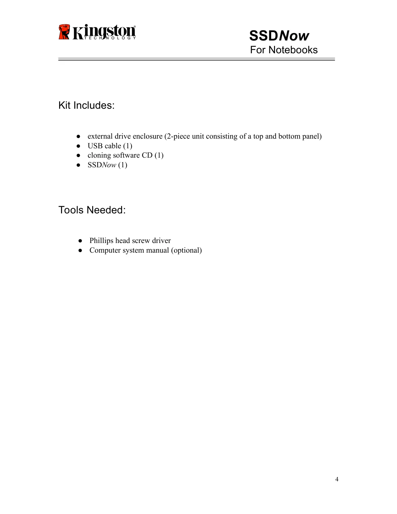 external drive enclosure (2-piece unit consisting of a top and bottom panel) USB cable (1) cloning software CD (1) SSDNow (1)