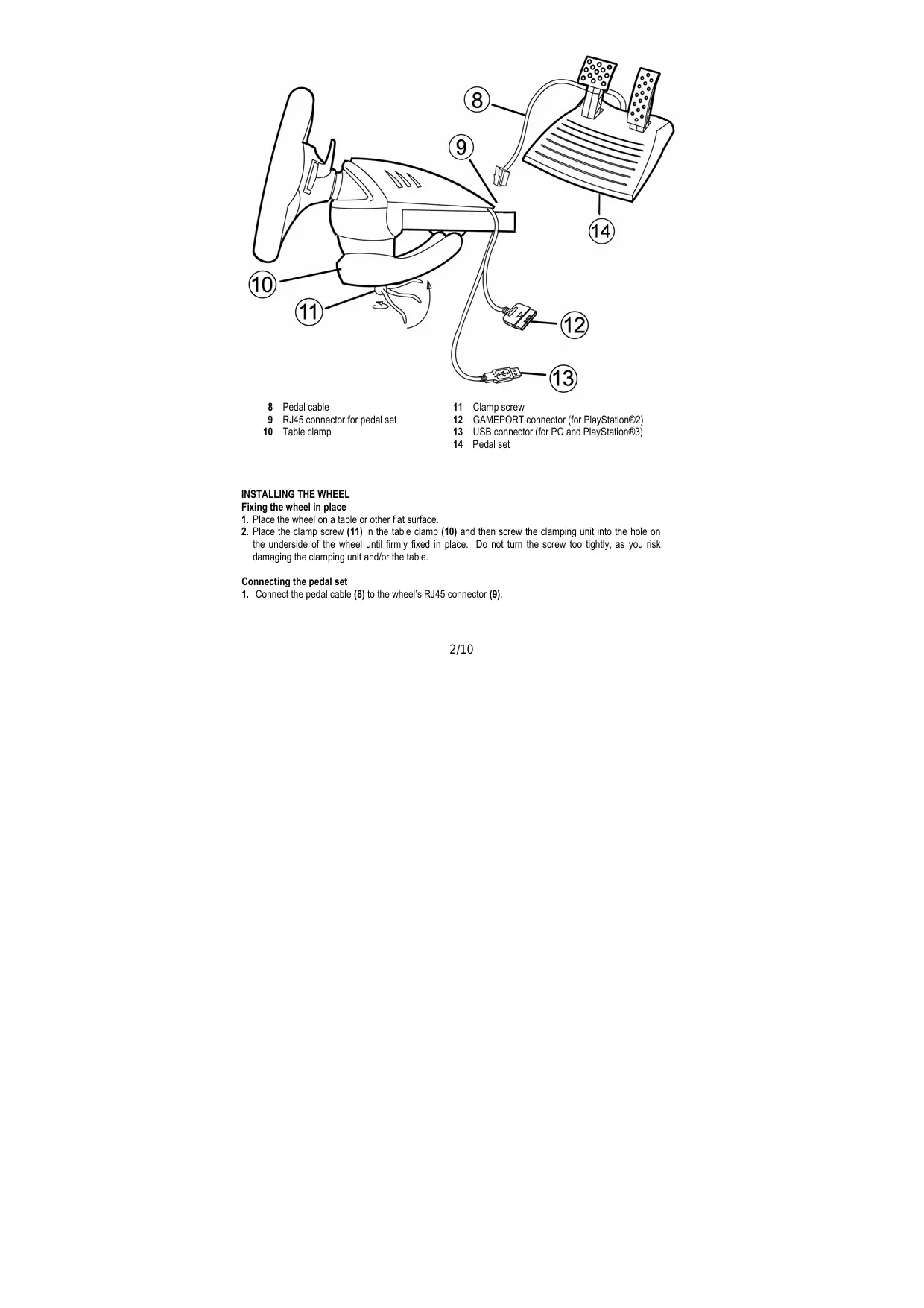 4/06/07 14:41:56 TECHNICAL FEATURES 1 2 digital gearshift levers (UP and DOWN) 2 LED 3 Action buttons 4 D-Pad 5 “SE” and “ST” buttons: - for Select and Start - for programming 6 “Home” button for PlayStation® 3 7 USB selector (“PC” / “PS3”) 1/10 8 Pedal cable 9 RJ45 connector for pedal set 10 Table clamp