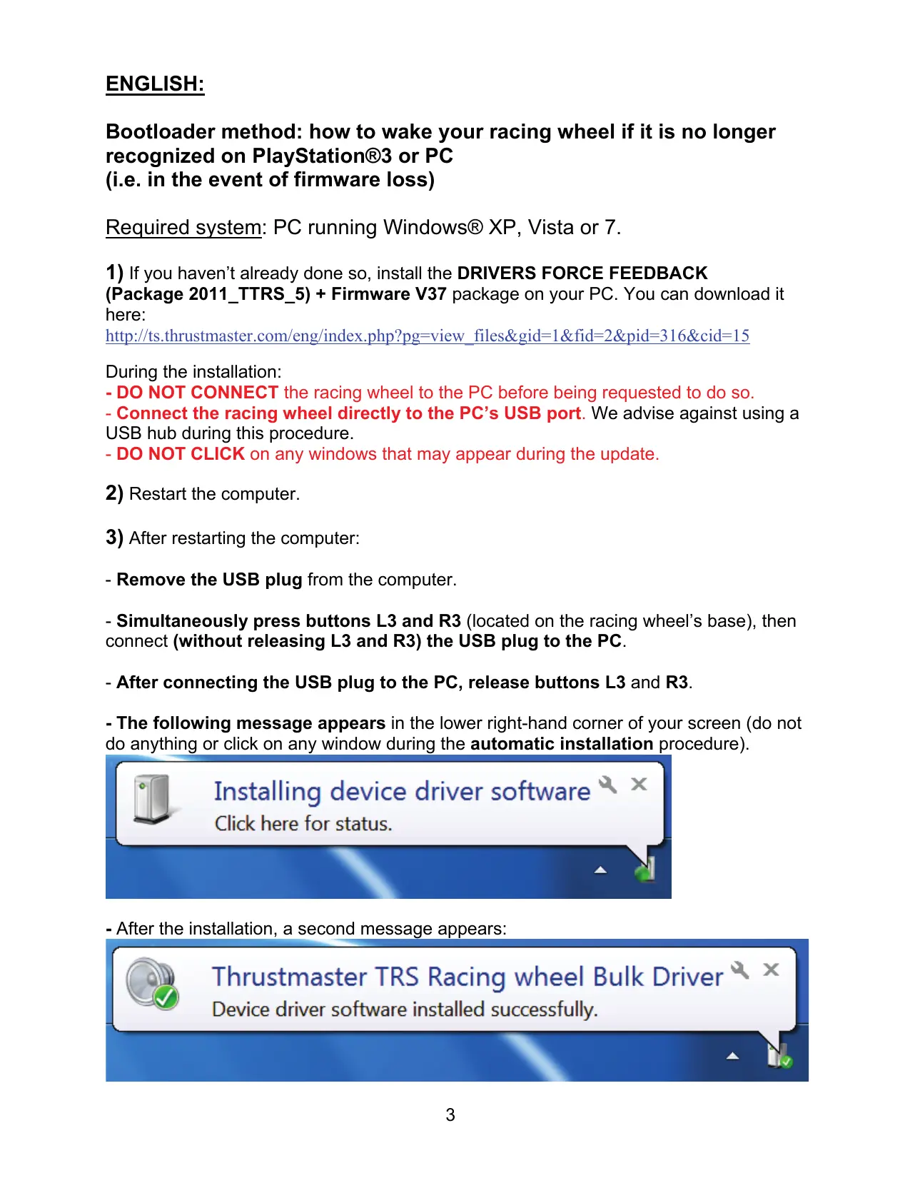 ENGLISH: Bootloader method: how to wake your racing wheel if it is no longer recognized on PlayStation®3 or PC (i.e. in the event of firmware loss) Required system: PC running Windows® XP, Vista or 7.