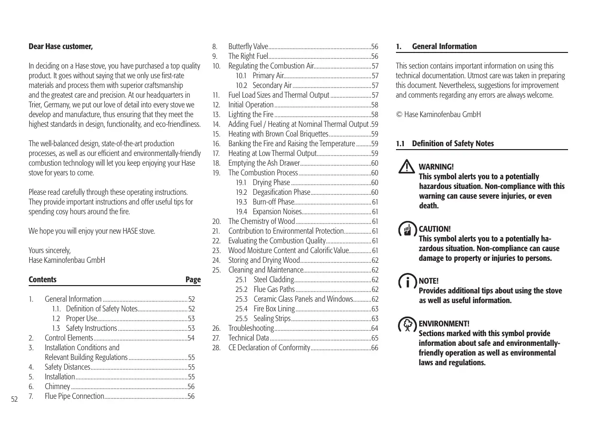 Dear Hase customer, In deciding on a Hase stove, you have purchased a top quality product. It goes without saying that we only use first-rate materials and process them with superior craftsmanship and the greatest care and precision. At our headquarters in Trier, Germany, we put our love of detail into every stove we develop and manufacture, thus ensuring that they meet the highest standards in design, functionality, and eco-friendliness. The well-balanced design, state-of-the-art production processes, as well as our efficient and environmentally-friendly combustion technology will let you keep enjoying your Hase stove for years to come. Please read carefully through these operating instructions. They provide important instructions and offer useful tips for spending cosy hours around the fire. We hope you will enjoy your new HASE stove. Yours sincerely, Hase Kaminofenbau GmbH Contents