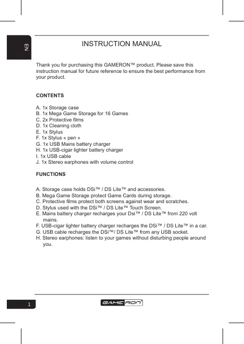 J. 1x Stereo earphones with volume control FUNCTIONS A. Storage case holds DSi™ / DS Lite™ and accessories. B. Mega Game Storage protect Game Cards during storage. C. Protective films protect both screens against wear and scratches. D. Stylus used with the DSi™ / DS Lite™ Touch Screen. E. Mains battery charger recharges your Dsi™ / DS Lite™ from 220 volt mains. F. USB-cigar lighter battery charger recharges the DSi™ / DS Lite™ in a car. G. USB cable recharges the DSi™/ DS Lite™ from any USB socket. H. Stereo earphones: listen to your games without disturbing people around you.