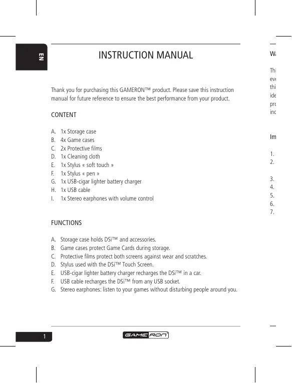 INSTRUCTION MANUAL Thank you for purchasing this GAMERON™ product. Please save this instruction manual for future reference to ensure the best performance from your product. CONTENT