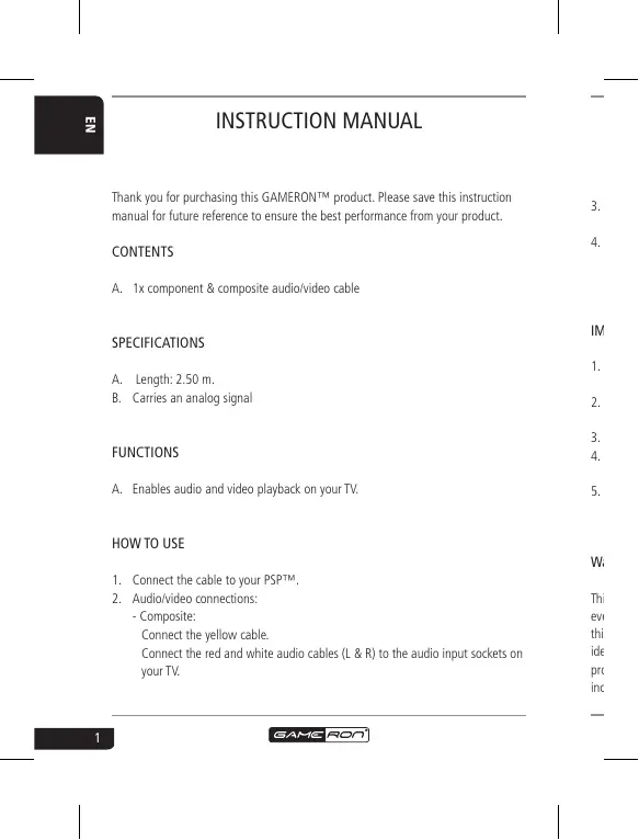 INSTRUCTION MANUAL Thank you for purchasing this GAMERON™ product. Please save this instruction manual for future reference to ensure the best performance from your product. CONTENTS A. 1x component & composite audio/video cable SPECIFICATIONS A. Length: 2.50 m. B. Carries an analog signal FUNCTIONS A. Enables audio and video playback on your TV.