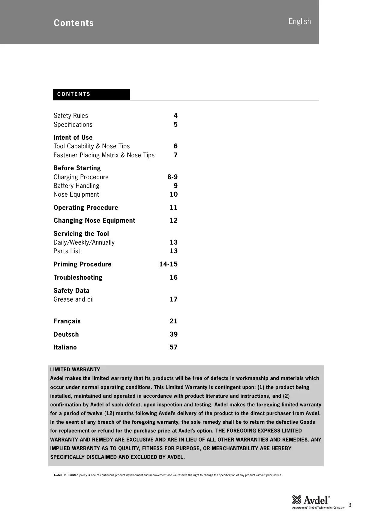 LIMITED WARRANTY Avdel makes the limited warranty that its products will be free of defects in workmanship and materials which occur under normal operating conditions. This Limited Warranty is contingent upon: (1) the product being installed, maintained and operated in accordance with product literature and instructions, and (2) confirmation by Avdel of such defect, upon inspection and testing. Avdel makes the foregoing limited warranty for a period of twelve (12) months following Avdel’s delivery of the product to the direct purchaser from Avdel. In the event of any breach of the foregoing warranty, the sole remedy shall be to return the defective Goods for replacement or refund for the purchase price at Avdel’s option. THE FOREGOING EXPRESS LIMITED WARRANTY AND REMEDY ARE EXCLUSIVE AND ARE IN LIEU OF ALL OTHER WARRANTIES AND REMEDIES. ANY IMPLIED WARRANTY AS TO QUALITY, FITNESS FOR PURPOSE, OR MERCHANTABILITY ARE HEREBY SPECIFICALLY DISCLAIMED AND EXCLUDED BY AVDEL. Avdel UK Limited policy is one of continuous product development and improvement and we reserve the right to change the specification of any product without prior notice.
