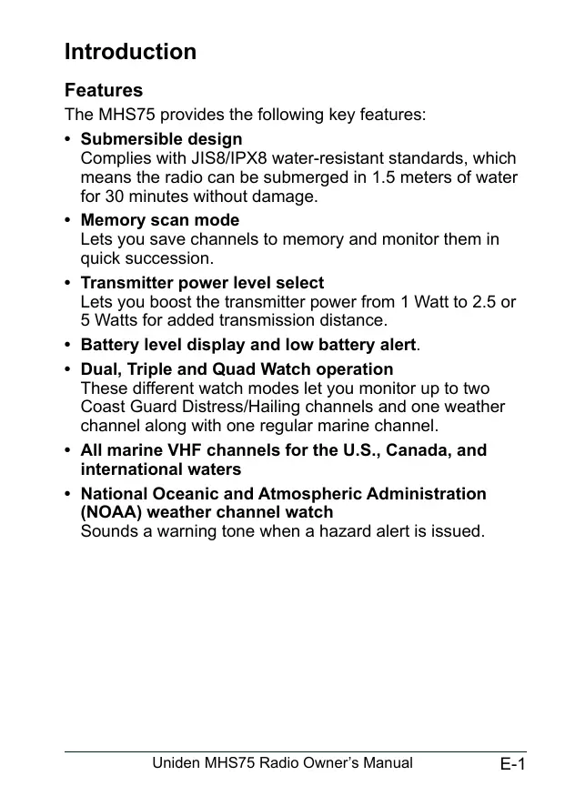 Vérifiez si votre radio est en marche. Appuyez sur la touche 16/9-Tri afin de commuter au canal 16 (156,800 MHz). (Si le canal 16 n’apparaît pas dans le coin de l’affichage, appuyez de nouveau sur 16/9-Tri jusqu’à ce qu’il soit affiché.) Appuyez sur le bouton Push to talk et dites : “MAYDAY – MAYDAY – MAYDAY”. Donnez l’identité de votre navire en disant : “ICI {nom ou indicatif d’appel de votre bateau}.” Dites : “MAYDAY {nom ou indicatif d’appel de votre bateau}.” Donnez votre emplacement : (quels sont les points de repère se trouvant près de vous ou lisez les coordonnées de longitude et de latitude apparaissant sur votre dispositif GPS). Révélez la nature de votre détresse, par exemple, êtesvous en train de couler, est-ce une urgence médicale, y a-t-il un homme à la mer, êtes-vous aux prises avec un incendie, êtes-vous à la dérive, etc.? Donnez le nombre de personnes à bord et les conditions des blessés, s’il y en a. Donnez la condition de navigabilité actuelle de votre navire, quel est le degré de l’urgence par rapport à l’inondation, à l’incendie ou à votre proximité de la côte? Donnez une brève description de votre navire (métrage, type, couleur, coque). Dites : “JE VAIS ÉCOUTER SUR LE CANAL 16”. Terminez le message en disant “ICI {nom ou indicatif d’appel de votre bateau} À VOUS.” Relâchez le bouton Push to talk et écoutez. Si vous n’obtenez pas de réponse après 30 secondes, répétez l’appel en commençant à l’étape 3 ci-dessus. Table of Contents Making a Distress Call................. (inside front cover) Introduction................................. E-1 Features....................................... E-1 Getting Started............................ E-2 What’s included............................ E-2 Parts of the MHS75...................... E-3 Front view.................................... E-3 Back view.................................... E-3 DC Charger................................. E-4 Reading the display...................... E-5 Display icons and what they mean....................................... E-5 How It Works............................... E-6 Normal mode operation................ E-7 Normal mode with Weather Alert Watch...................................... E-7 Normal mode with Triple Watch or Dual Watch.............................. E-8 Normal mode with Quad Watch.. E-8 Scan mode operation................... E-9 Using the radio in scan mode .... E-9 Scan mode with Weather Alert Watch.................................... E-10 Scan mode with Triple Watch or Dual Watch............................ E-10 Both Weather Alert and Triple/Dual Watch in scan mode.............. E-10 Weather mode.............................E-11 Using the radio in weather mode......................................E-11 Weather mode with Weather Alert Watch.....................................E-11 Weather mode with Triple Watch or Dual Watch....................... E-12 Setting Up the Hardware.......... E-12 Attaching the antenna................. E-12 Installing the battery................... E-12 Charging the battery................... E-13 Connecting the charger............. E-13 Important notes on charging the battery................................... E-13 Disconnecting the charger........ E-14 Attaching the belt clip................. E-14 Using Your Radio...................... E-15 Changing the volume ................ E-15 Setting the squelch level............. E-15 Changing the channel................. E-15 Making a transmission................ E-16 Boosting the transmission power.................................... E-16 Setting the UIC channel mode.... E-17 Maintenance and Troubleshooting..................... E-17 Common questions..................... E-17 Specifications........................... E-18 Channels and Frequencies......... E-19 US channel frequencies and names................................... E-19 Canadian channel frequencies and names................................... E-21 International channel frequencies and names............................ E-23 Weather channel frequencies and names................................... E-25 Regulations and Safety Warnings................................ E-26 Maritime radio services operation.................................. E-26 Basic radio guidelines................. E-26 FCC/Industry Canada information............................... E-27 FCC RF exposure information.... E-27 Lithium ion battery warning......... E-28 Three Year Limited Warranty Statement............................... E-29 Uniden MHS75 Radio Owner’s Manual Introduction Features The MHS75 provides the following key features: