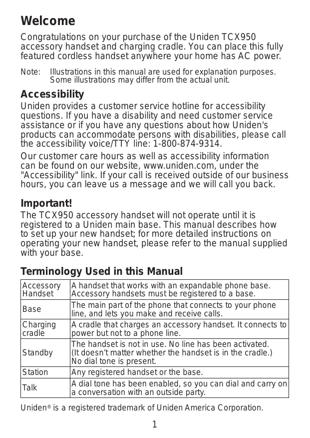 Welcome Congratulations on your purchase of the Uniden TCX950 accessory handset and charging cradle. You can place this fully featured cordless handset anywhere your home has AC power. Note: _ Illustrations in this manual are used for explanation purposes. Some illustrations may differ from the actual unit. Accessibility Uniden provides a customer service hotline for accessibility questions. If you have a disability and need customer service assistance or if you have any questions about how Uniden's products can accommodate persons with disabilities, please call the accessibility voice/TTY line: 1-800-874-9314. Our customer care hours as well as accessibility information can be found on our website, www.uniden.com, under the "Accessibility" link. If your call is received outside of our business hours, you can leave us a message and we will call you back. Important! The TCX950 accessory handset will not operate until it is registered to a Uniden main base. This manual describes how to Set up your new handset; for more detailed instructions on operating your new handset, please refer to the manual supplied with your base Terminology Used in this Manual Accessory [A handset that works with an expandable phone base. Handset |Accessory handsets must be registered to a base. Base The main part ofthe phone that connects to your phone line, and lets you make and receive calls. Charging [A cradle that charges an accessory handset. It connects to cradie power but not to a phone line. The handsetis not in use. No line has been activated. Standby |{it doesn't matter whether the handset is in the cradle.) No dial tone is present. Station [Any registered handset orthe base ak À dial tone has been enabled, so you can dial and carry on conversation with an outside party. Uniden® is a registered trademark of Uniden America Corporation.