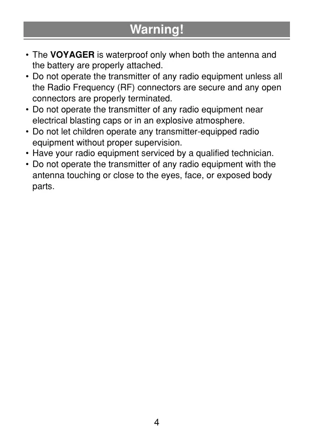 + The VOYAGER is waterproof only when both the antenna and the battery are properly attached. + Do not operate the transmitter of any radio equipment unless all the Radio Frequency (RF) connectors are secure and any open connectors are properly terminated. + Do not operate the transmitter of any radio equipment near electrical blasting caps or in an explosive atmosphere. + Do not let children operate any transmitter-equipped radio equipment without proper supervision. + Have your radio equipment serviced by a qualified technician. + Do not operate the transmitter of any radio equipment with the antenna touching or close to the eyes, face, or exposed body parts.