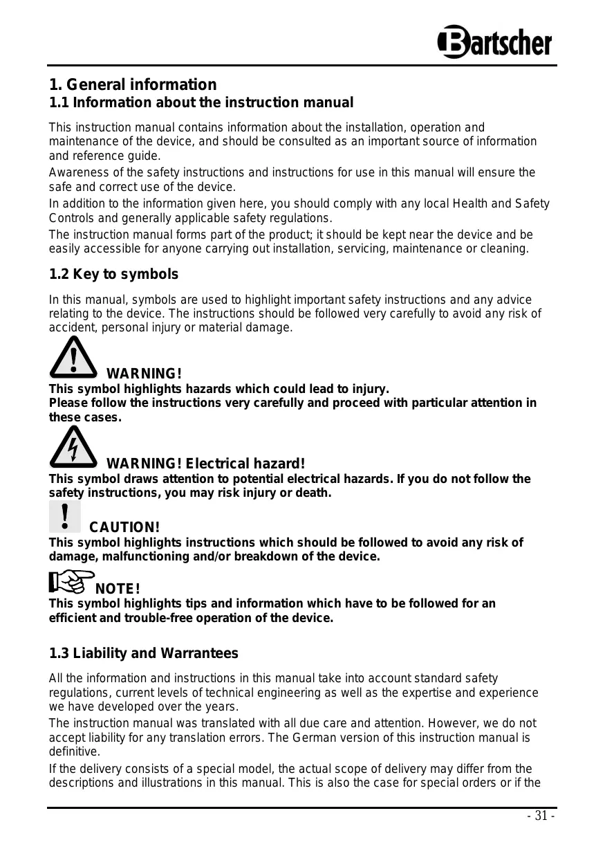 o Check the mains lead from time to time to ensure itis not damaged in any way. Never use the device if the lead is damaged. lfthe lead is damaged, it must be replaced by a qualified electrician. o Incase of damage or malfunction, please contact your stockist or our customer service centre. o Only a qualified technician using original spare parts and accessories should carry out repairs and maintenance of the device. Do not attempt to repair the device yourself. Bartscher GmbH Franz-Kleine-Str. 28 D-33154 Salzkotten phone: +49 (0) 5258 971-0 Germany fax: +49 (0) 5258 971-120