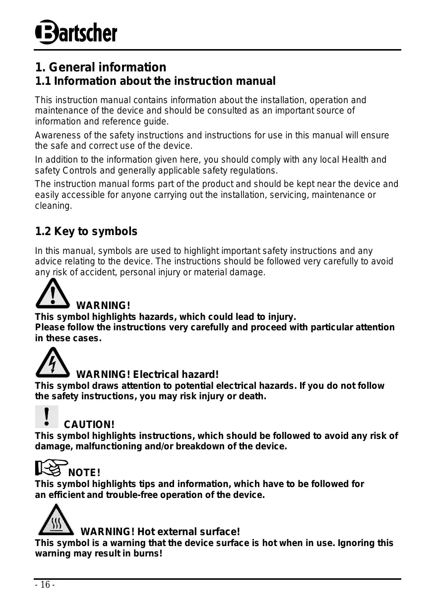 In this manual, symbols are used to highlight important safety instructions and any advice relating to the device. The instructions should be followed very carefully to avoid any risk of accident, personal injury or material damage. WARNING! This symbol highlights hazards, which could lead to injury. Please follow the instructions very carefully and proceed with particular attention in these cases. WARNING! Electrical hazard! This symbol draws attention to potential electrical hazards. If you do not follow the safety instructions, you may risk injury or death. CAUTION! This symbol highlights instructions, which should be followed to avoid any risk of damage, malfunctioning and/or breakdown of the device. NOTE! This symbol highlights tips and information, which have to be followed for an efficient and trouble-free operation of the device. WARNING! Hot external surface! This symbol is a warning that the device surface is hot when in use. Ignoring this warning may result in burns!